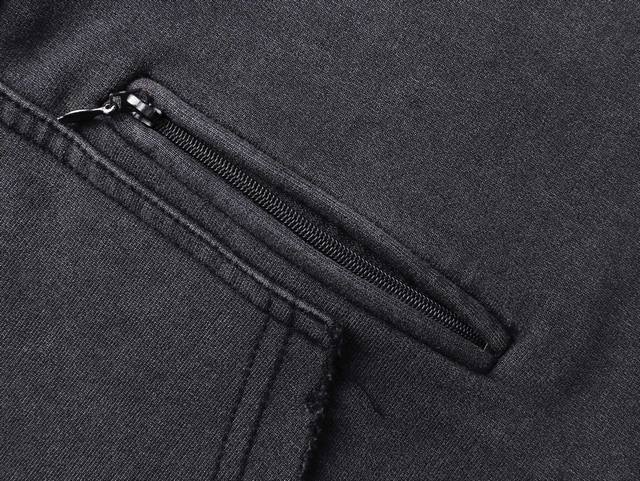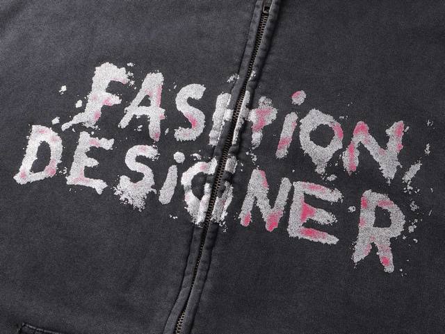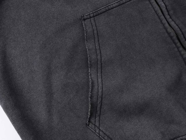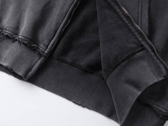 . Features a faux zipper on the left front and a zippered front hooded sweatshirt. Raw edges are stitched on the reverse side of the cuffs and hem. Finished garment washed, hand-distressed. Extremely complex craftsmanship.