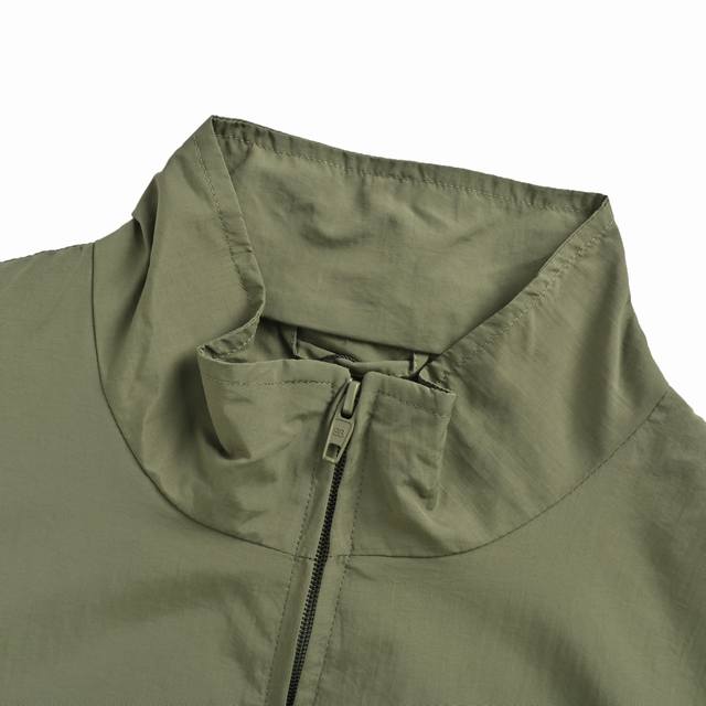 Side zipper pockets. Small high stand-up collar.