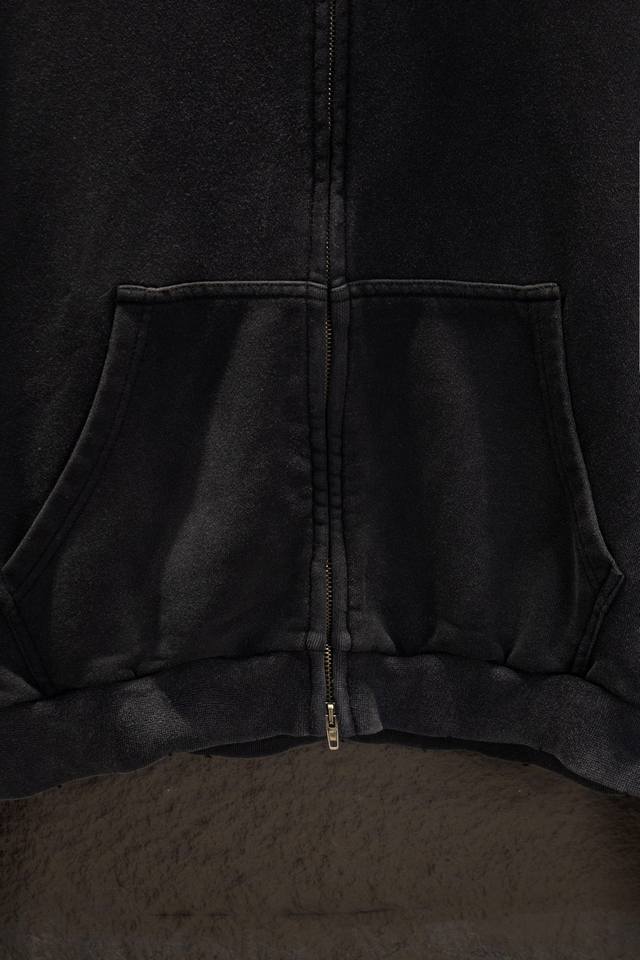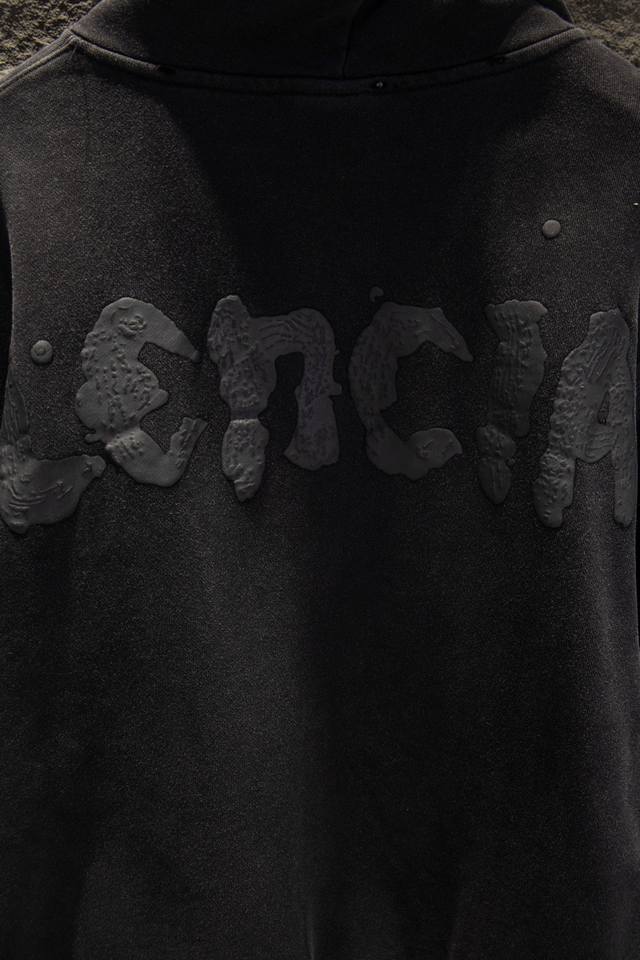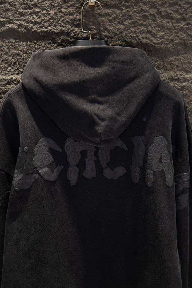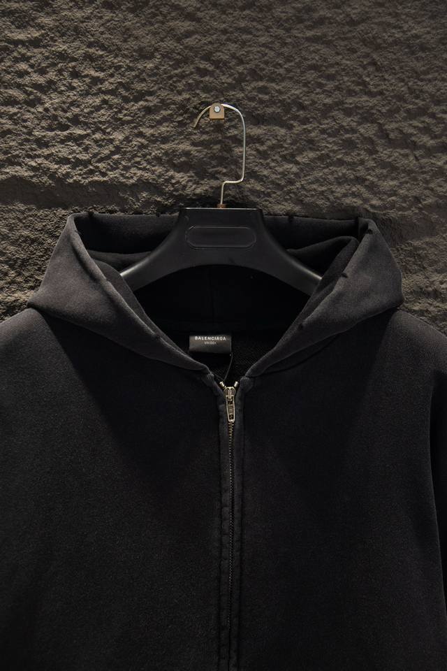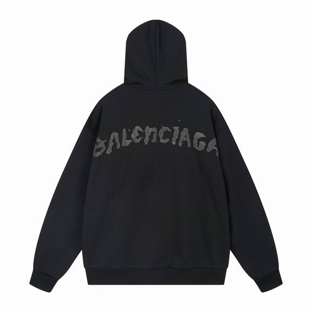 Balenciaga 25Ss Graffiti Washed Distressed Hooded Jacket. Made with custom-dyed terry cotton sweatshirt fabric, 450g double-ply double-yarn, comfortable to the touch, and crafted with imported knitting needles. Moderate thickness, with a good drape and structured silhouette, it's incredibly comfortable to wear! Highly forgiving for slightly chubby figures, making you look instantly slimmer! The back features an artistic arrangement of English letters with a three-dimensional print that enhances the feel. The washed, distressed elements on the body add a playful touch and a unique visual effect. The loose, tapered hem is made of double-layered fabric with a neat and refined edge finishing. Color: Washed Black/Red. Sizes: Xs-SML .