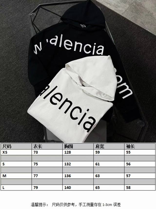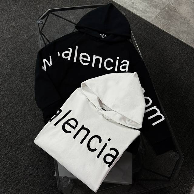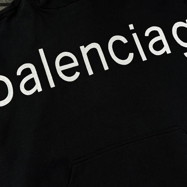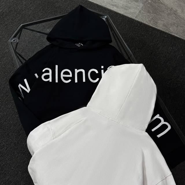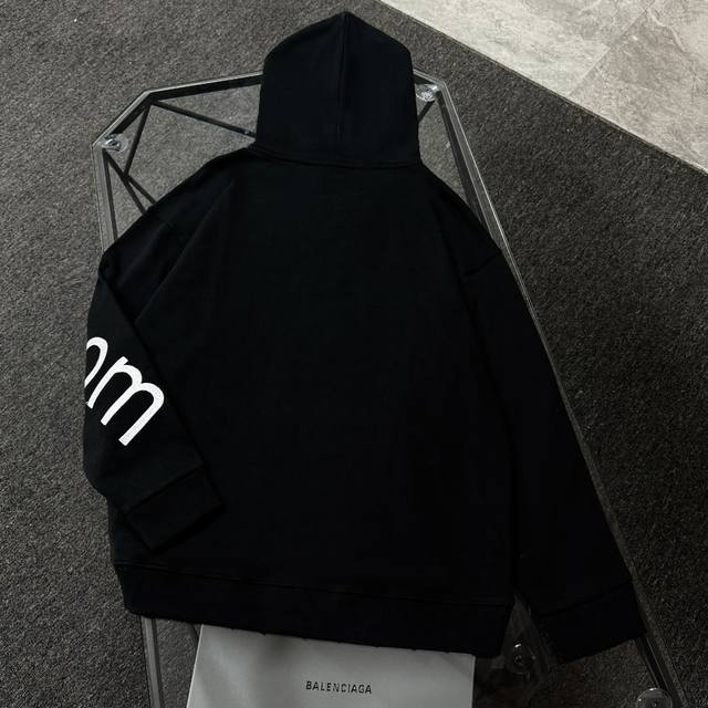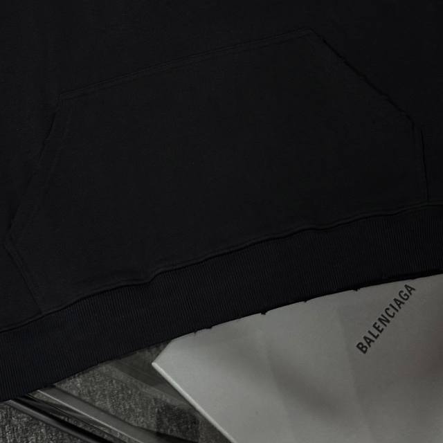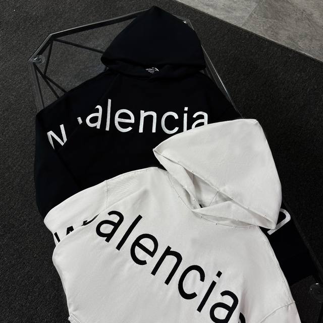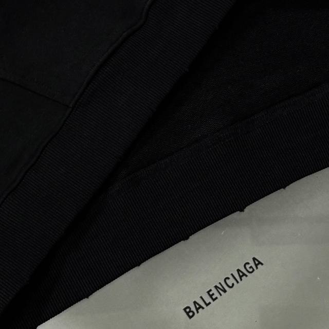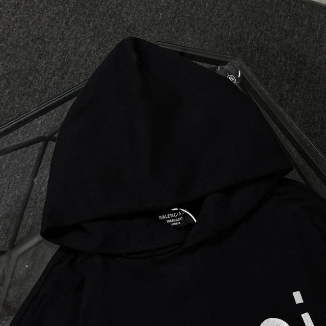 Balenciaga 25th generation high-quality hooded sweatshirt, drop-shoulder loose fit, 100% cotton fabric, 480g/m?, no deformation or shrinkage, complete with tags, unisex style. Features: distressed and ripped details, imported Conoco digital direct-to-garment printing, hand-distressed and ripped details, imported machine embroidery. Colors: Black, White. Sizes: XS-L.