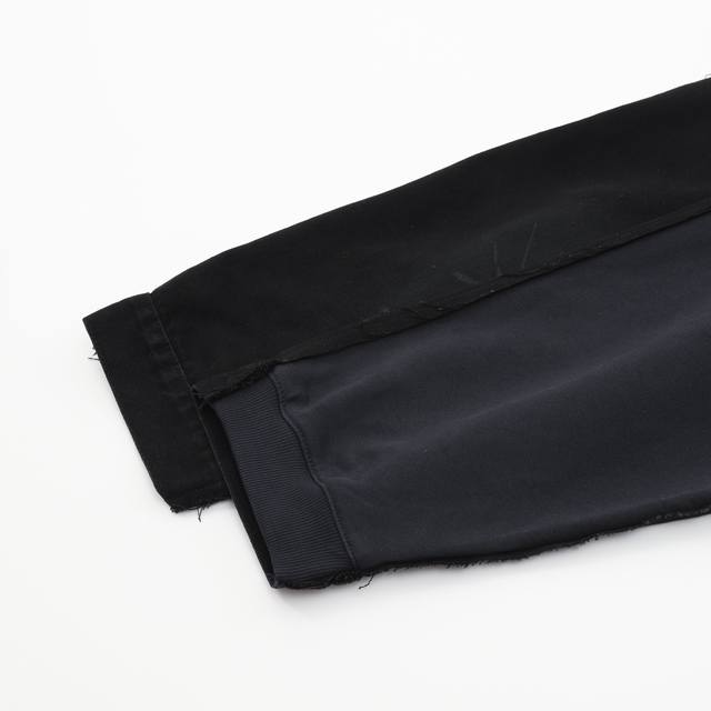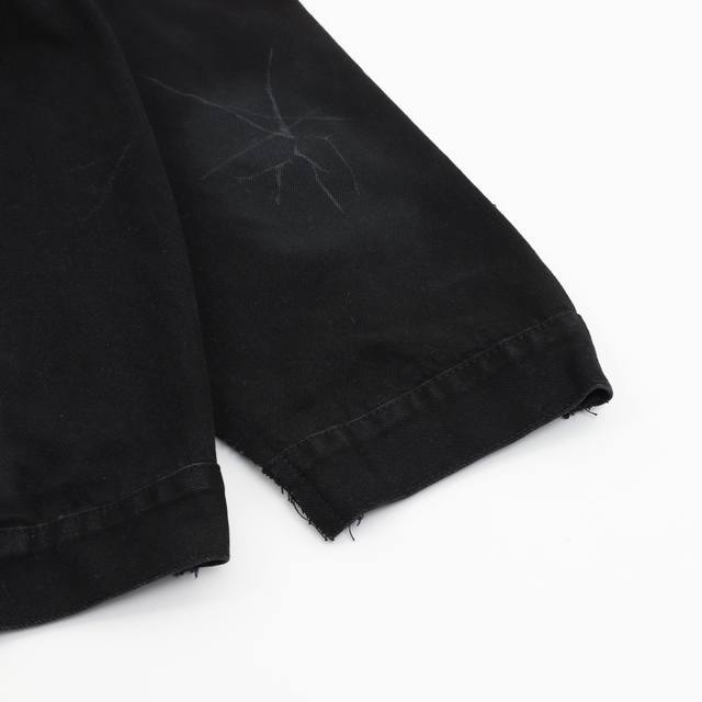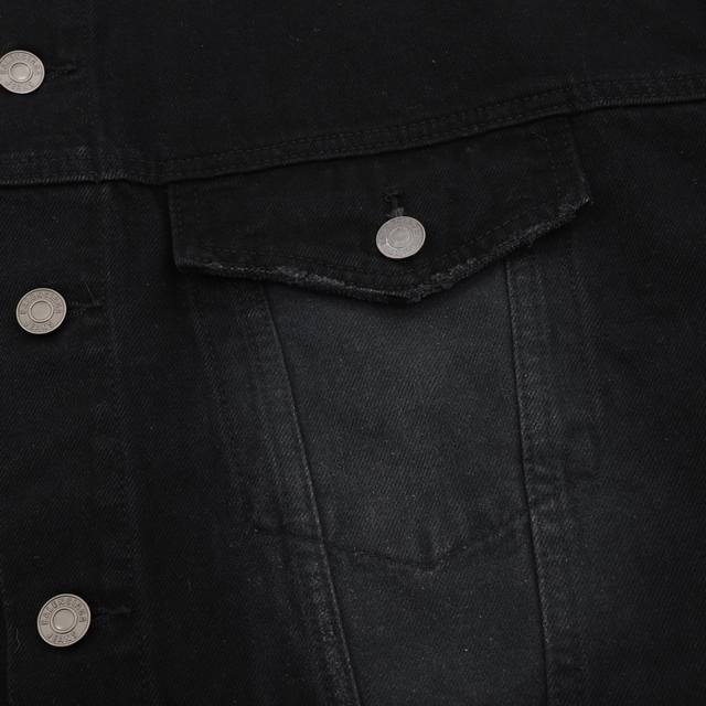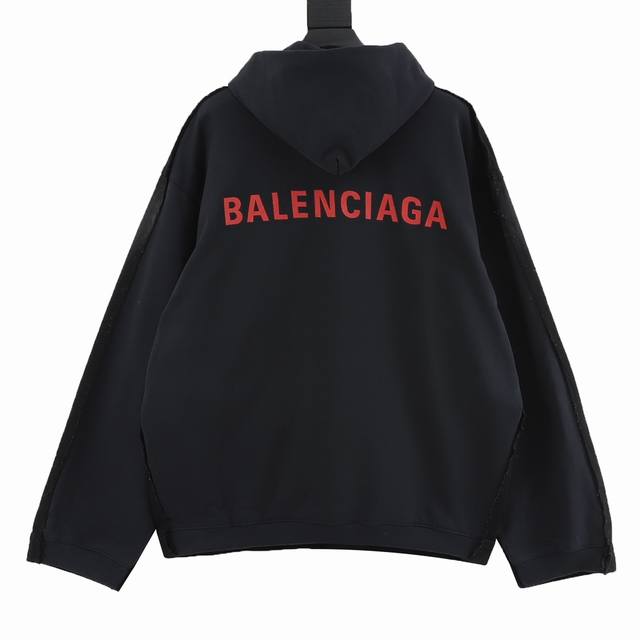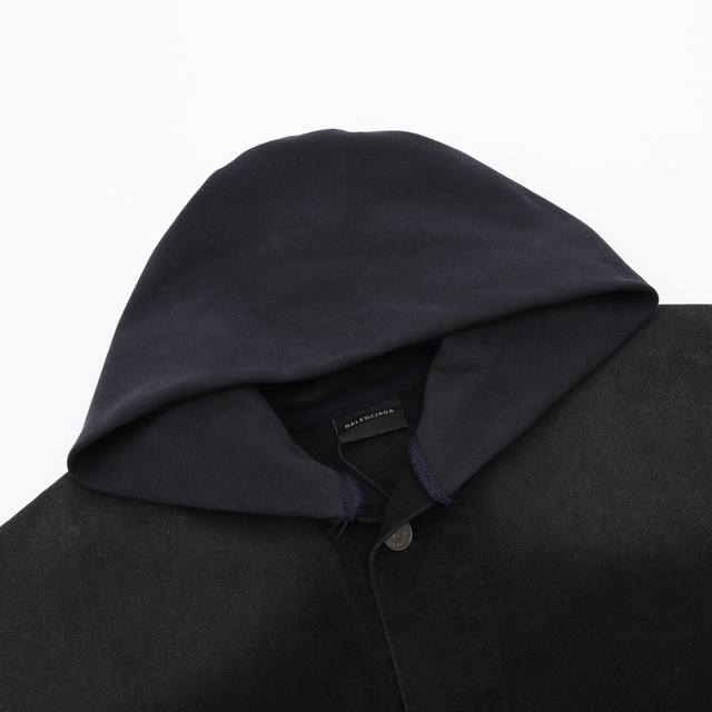 Balenciaga (Blcg) Embroidered Patchwork Hooded Denim Jacket. Made with custom-woven pure cotton denim and brushed sweatshirt fabric, featuring imported machine embroidery technology and a distressed edge technique for a natural frayed effect. A combination of high-temperature steam and sandpaper removes fiber fuzz and color differences, creating a unique distressed and worn look. Embedded stitching ensures smooth, neat, and clean seams. Multiple monkey-sanding techniques using a high-pressure spray gun achieve a localized gradient effect. Electrolytic gradient black stone washing and hot water cleaning are used for a specific washing effect. Loose fit. Size: Xs-L.