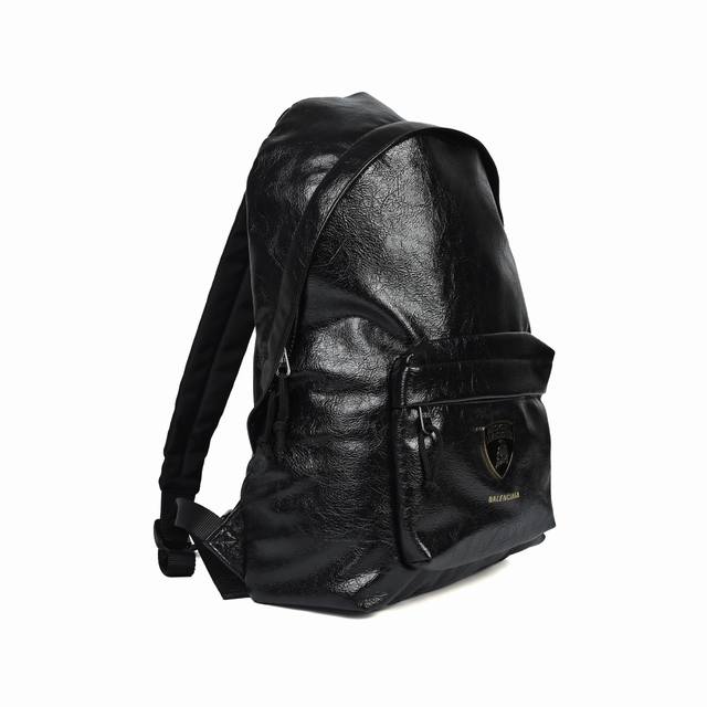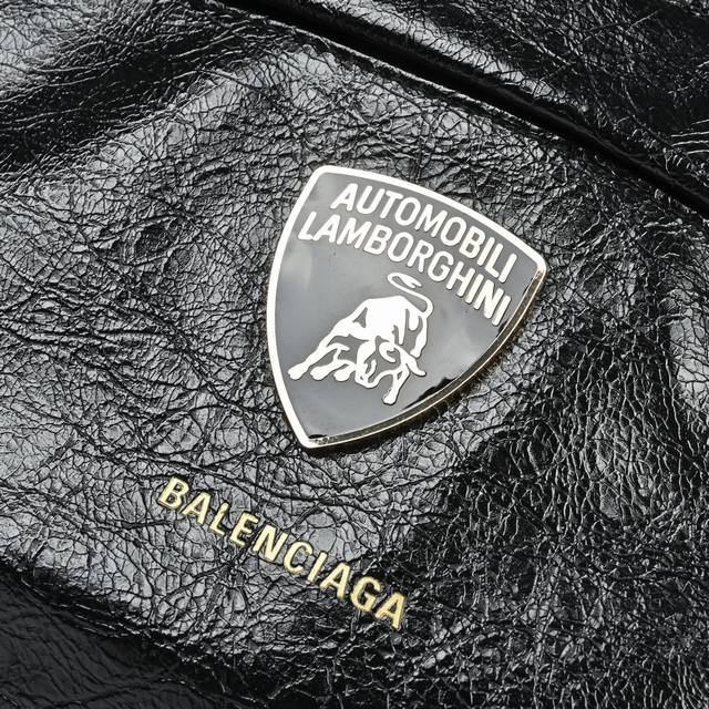 Balenciaga Lamborghini Collaboration Oil-Waxed Leather Backpack. Super fine, wrinkled oil-waxed leather, luxurious texture, adorned with the iconic Lamborghini crest. Highly recommended for short trips and daily commutes! Size: 31