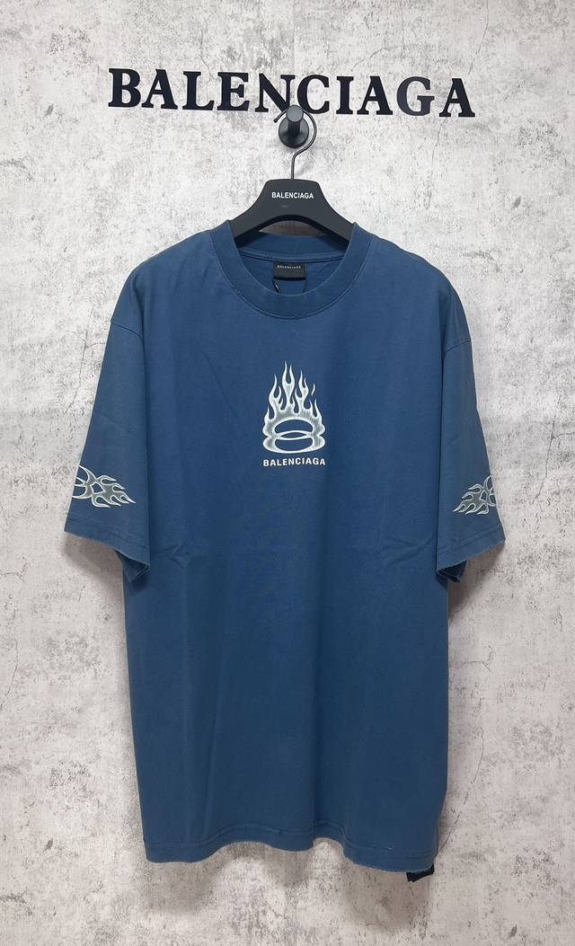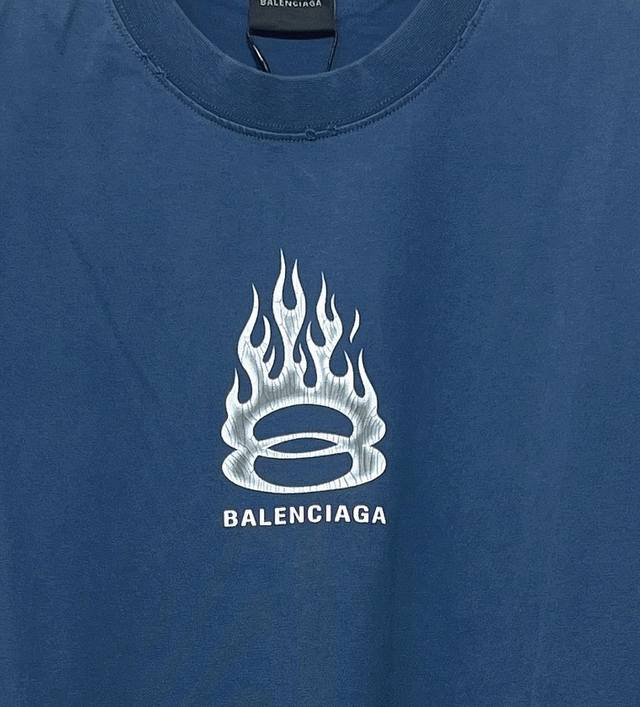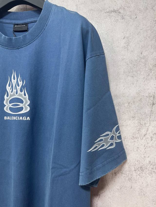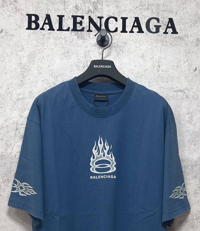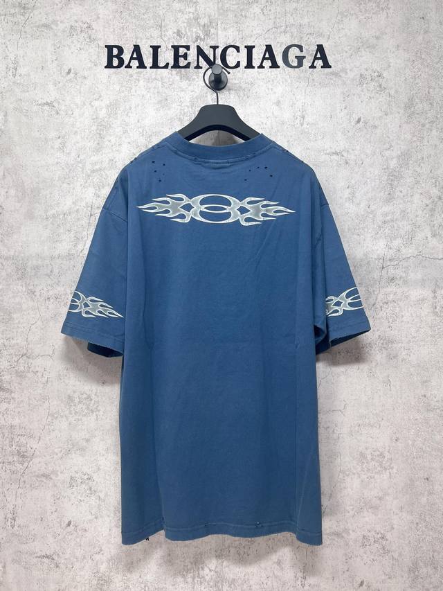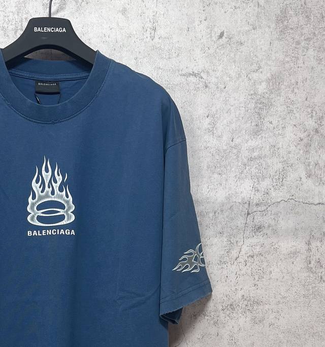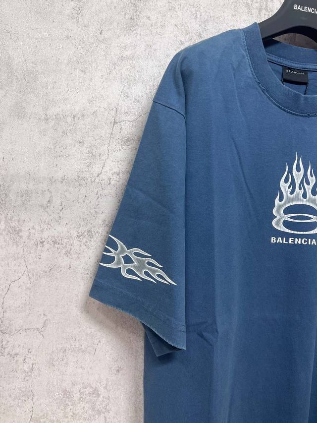 Washed and distressed flame ring printed short-sleeved T-shirt