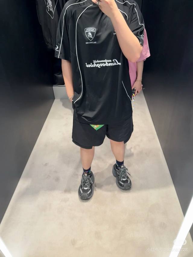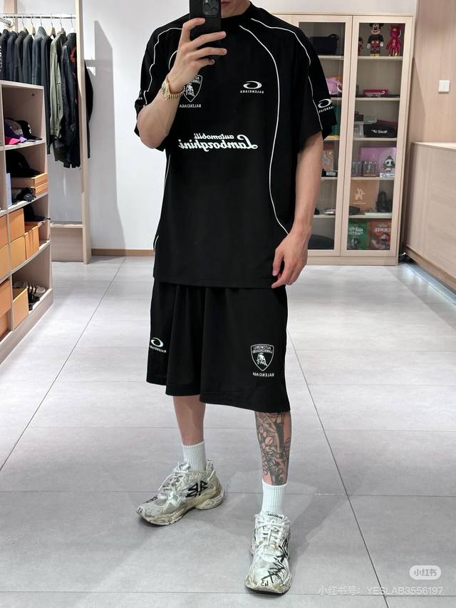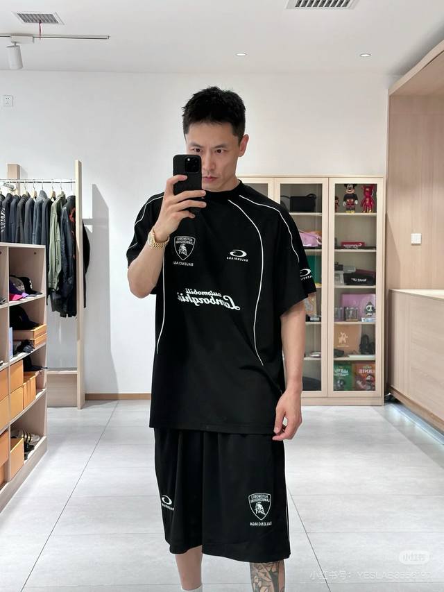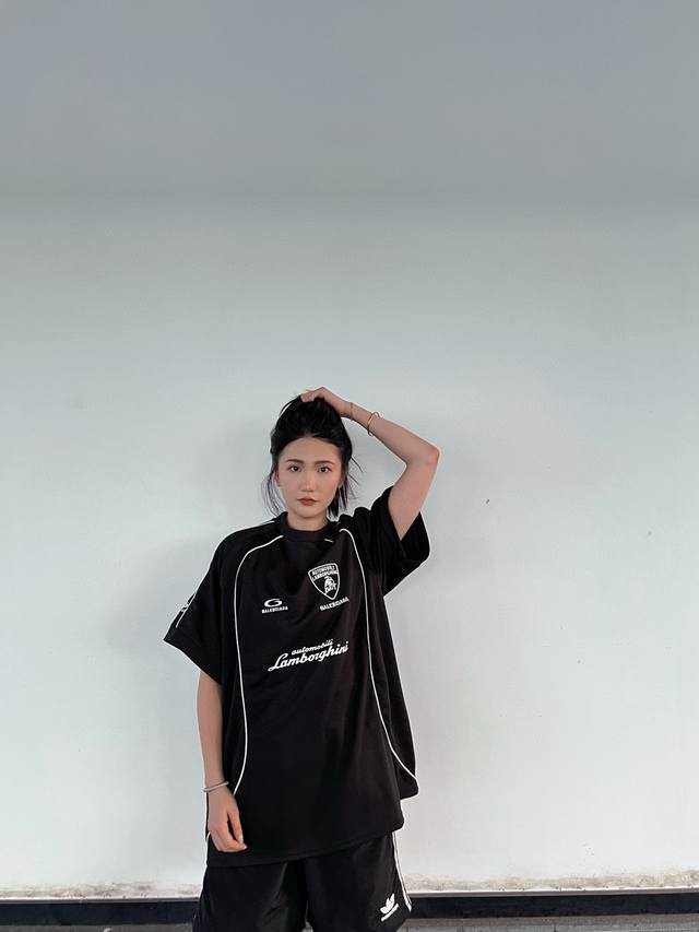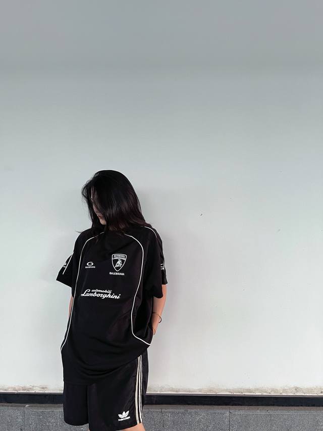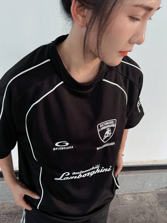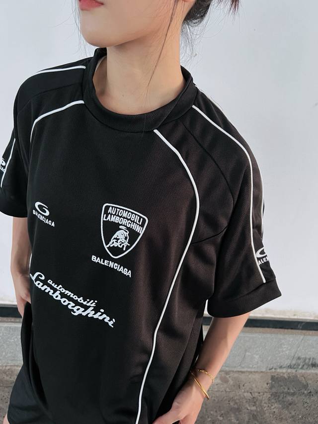 Balenciaga Top-Tier 1:1 Official Quality Balenciaga & Lamborghini Collaboration Football Series No. 63 Short-Sleeve T-Shirt. Made of custom sportswear with a technical mesh plain knit fabric, featuring Lamborghini Team artwork prints and embroidery on the front and back, Balenciaga logo designed for Automobili Lamborghini, and embroidered details on the left and right sleeves. Multi-panel short sleeve. Color: Black. Size: Xs, S, M, L.
