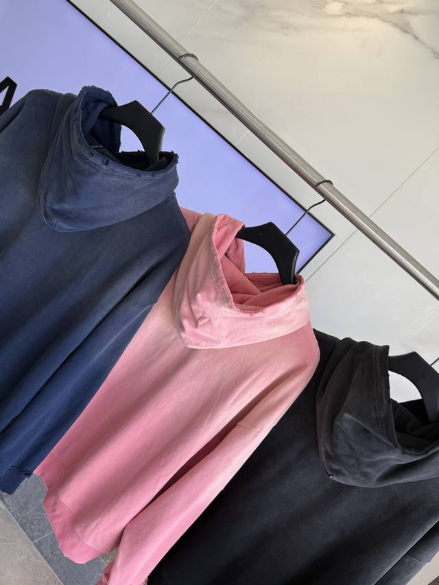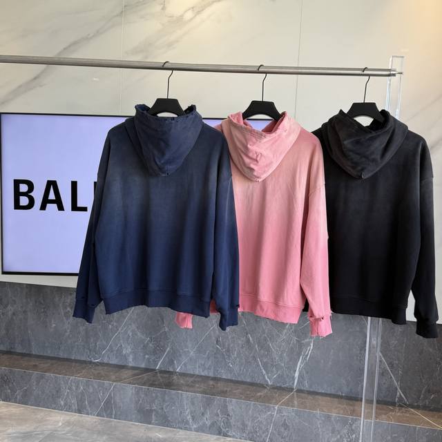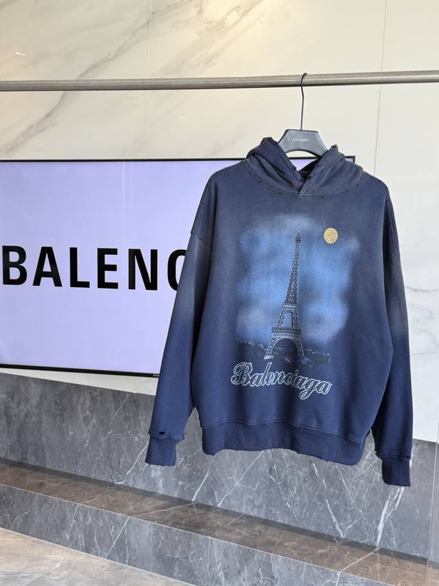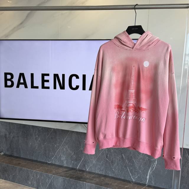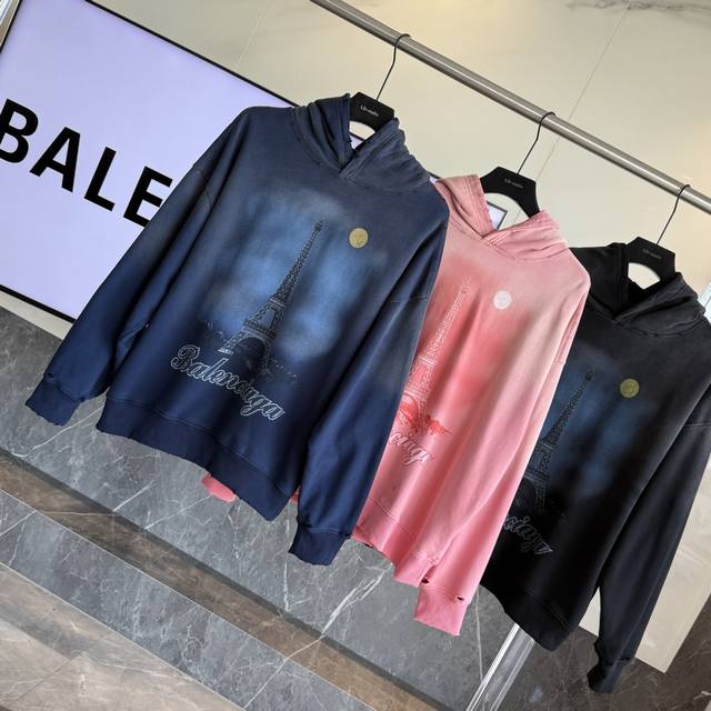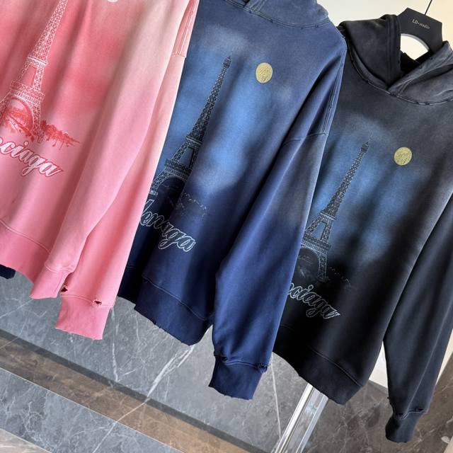 Balenciaga's latest Paris Eiffel Tower inkjet graffiti hand-painted gradient color print distressed hoodie. Super heavy-duty craftsmanship, same as brick-and-mortar stores. Different from common market goods, genuine product research and development. This style is black with an enzyme wash, not the incorrectly washed black found in the market. Weight 440g, distressed. Hand-painted details are identical to the original, printing uses Conlix digital direct-to-garment printing. Garment washed distressed and distressed. Graffiti hand-painted. Super heavy-duty design and craftsmanship throughout. Welcome to compare. The design features a relaxed, drop-shoulder fit. Unisex. Colors: Blue, Pink, Dark Blue. Sizes: S, M, L, XL. Size Chart: S (Length, Chest, Shoulder Width, Sleeve Length, Weight): S 70cm, 128cm, 66cm, 56cm (110-150 lbs); M (-73cm, 132cm, 68cm, 58cm (150-170 lbs); L (-76cm, 136cm, 70cm, 60cm (170-190 lbs); XL (-79cm, 140cm, 72cm, 62cm (190-220 lbs)).