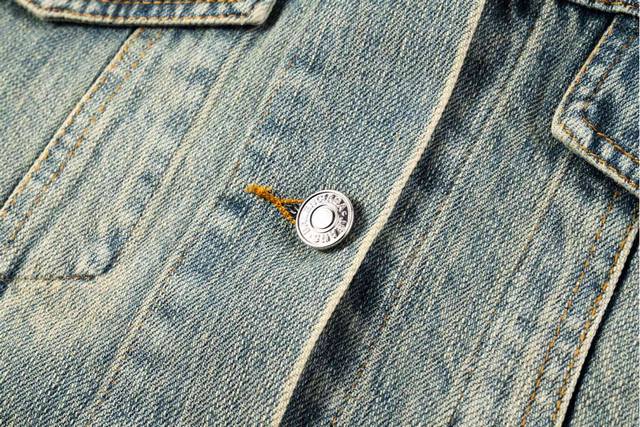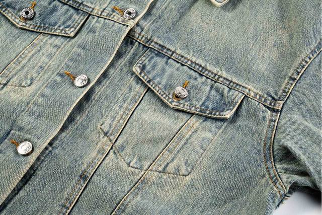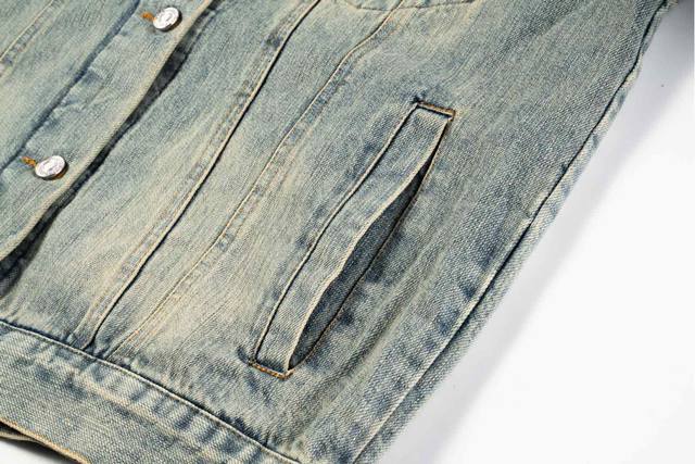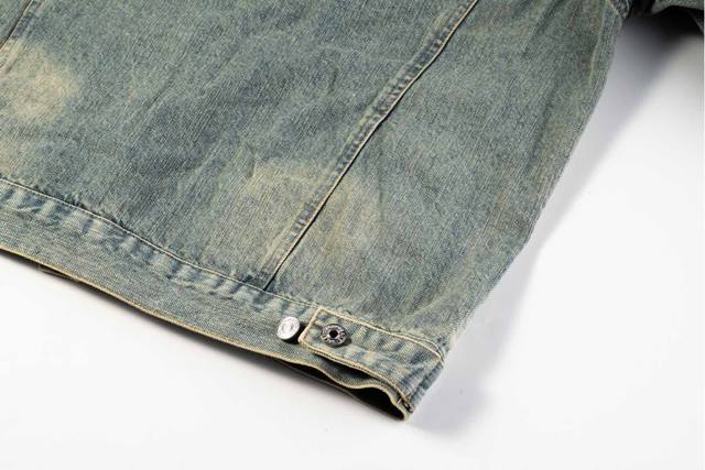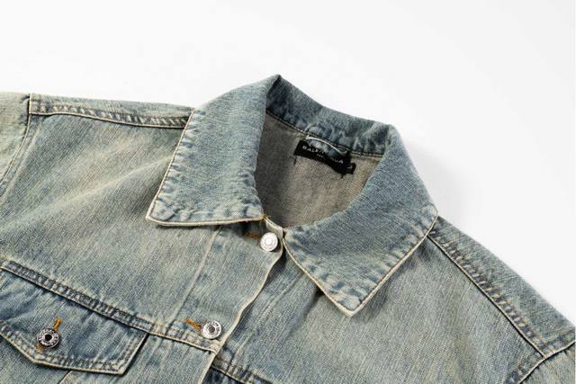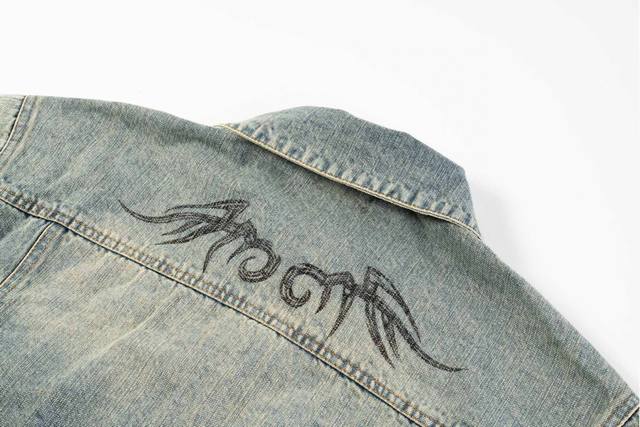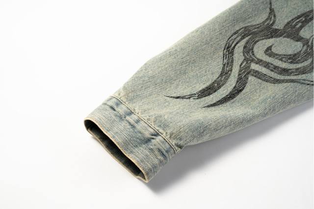 Balencia24Fwy2K show-style denim jacket, hand-painted totem pattern, the totem is not symmetrical, following the original position, washed and faded bamboo grain, the color transition is very perfect, the material is manually swept to make it old and dirty, the washing is a double process stone washing + enzyme washing to make it horse slip, the whole body is old and washed, the bone edges are damaged
