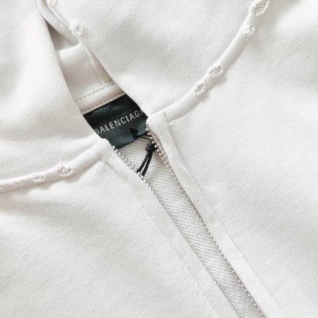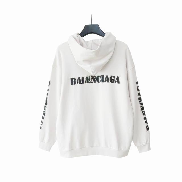 New Arrival - Real Shot Details + Size Chart Balenciaga Blurred Logo Hooded Sweatshirt Features a distressed finish on the cuffs and hem, double-stitched seams, and straight stitching. The logo on the front and back is spray-printed for an overall distressed, blurred effect. The neckline and shoulders feature a hand-distressed finish. The stitching details are impeccable. Made of 420g pure cotton, this sweatshirt is a double-yarn combed cotton. All tags are included, along with size stickers and a logo dustproof paper. Color: Grayish White Sizes: XS-L