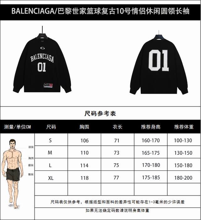 Real shot details + size chart. Balenciaga basketball retro size 10 casual round neck long-sleeved shirt for couples. Top version! 26-count 280g double yarn cotton fabric! Large logo on the front and back with imported embroidery and printing! Accessories: Original mold, authenticated neck label, 100% silk washing label. Authentic original hangtag, matching lanyard, 3D hang tag, original packaging bag. Craftsmanship: Consistent stitching! Highest version armhole matching technique! Countless pattern making to perfectly reproduce the authentic product! Correct version, unisex, super eye-catching, super good-looking, super stylish! Colors: White, Black. Sizes: S-XL.