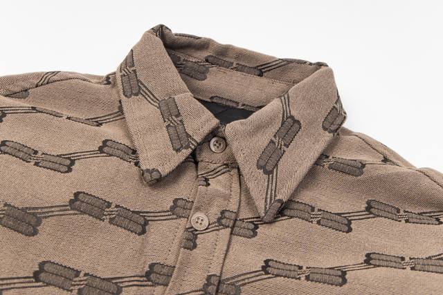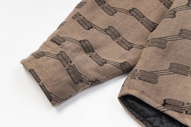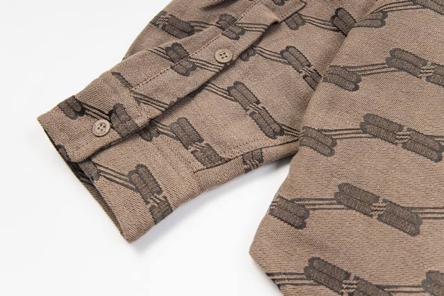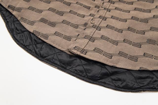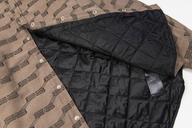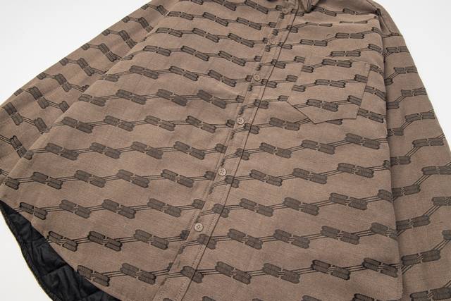 Style No. #S631 Balenciaga 24Fw Runway Style Vintage Jacquard Collar Shirt Jacket with Double B Lock - Correct Version Made from high-density cotton canvas, dyed and fully jacquard, classic Bb monogram pattern. The inner lining features diamond-quilted cotton, selected long-staple cotton for warmth and comfort. The oversized silhouette is designed with a fixed floral pattern and a replica floral pattern on the front placket. Hand-cut. Original mold, custom brand logo, five-prong snap buttons, original main label, washing label, hang tag, and packaging bag. Colors: Black, Khaki. Sizes: 46, 48, 50, 52. Size Chart: Length, Chest, Shoulder Width, Sleeve Length 46: 68, 130, 51, 55 48: 70, 134, 53, 56 50: 72 138 55 57 Ddd 52
