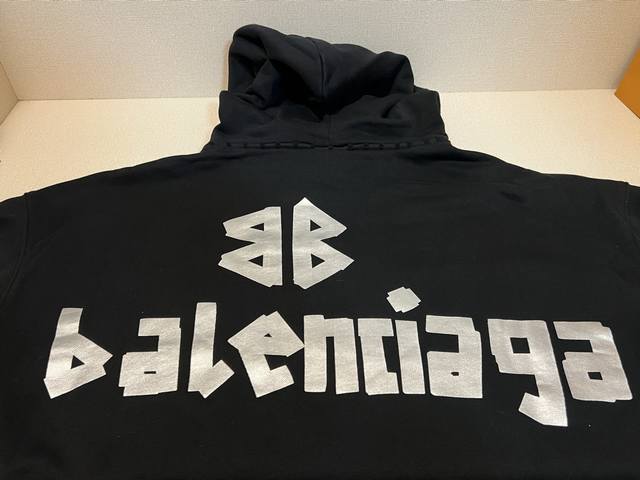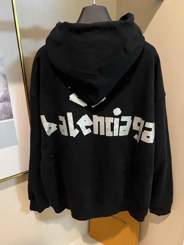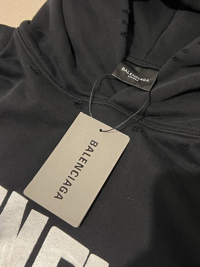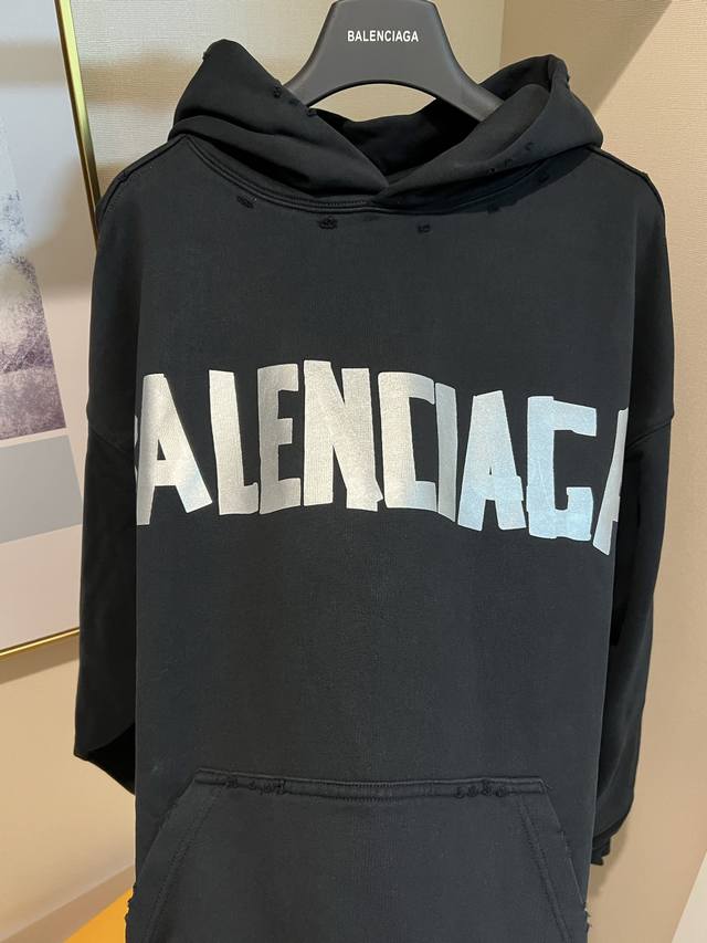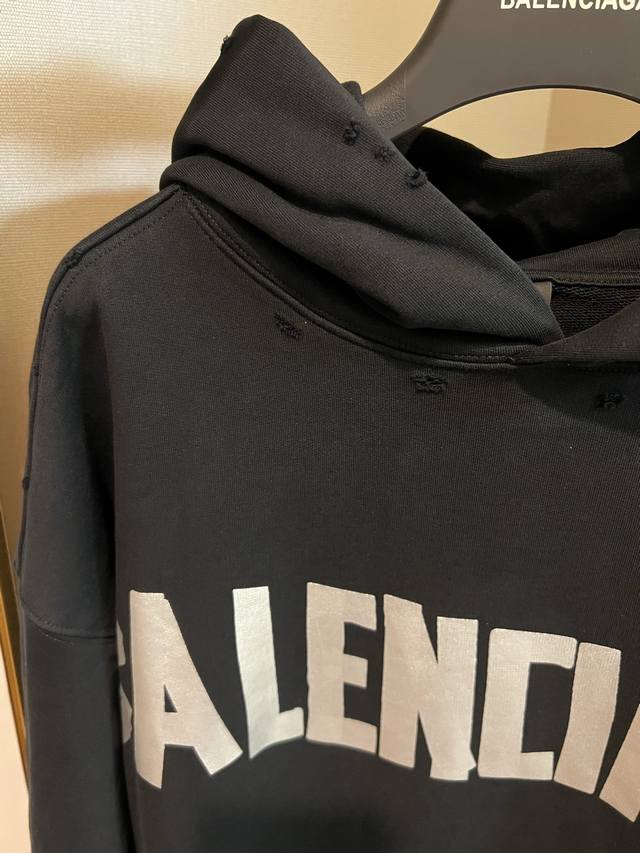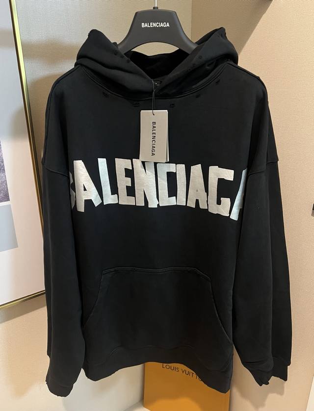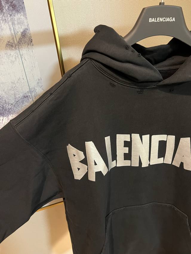. Sizes: Xs, S, M, Xl, black. Balenciaga #25Fw autumn/winter collection, taped letter-ripped hooded sweatshirt with artistic hood. Fall/winter wardrobe sync. Compare. Made from a Paris Zp custom-woven and dyed all-cotton washed sweatshirt, featuring crisp, soft, and comfortable texture. The threading is custom-woven and dyed for a flawless look. The classic letter logo is printed using precision screens, black silver foil, and off-white asphalt paste. The loose-fitting, ultra-complex hand-ripped garment is washed and fermented, resulting in high quality. Our goal is to replicate the stitching 1:1 with the original, ensuring you experience the highest quality.