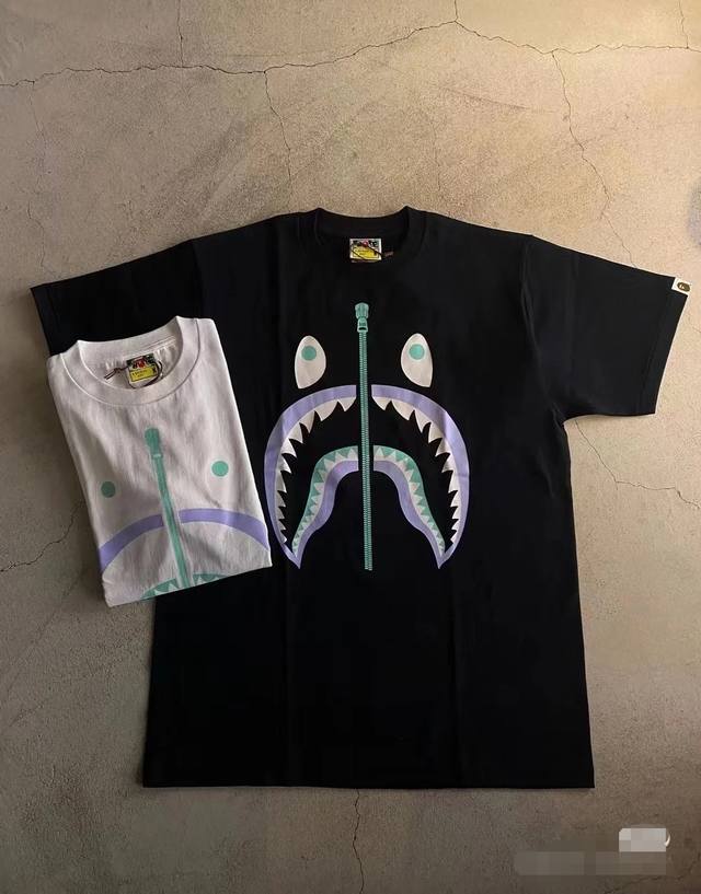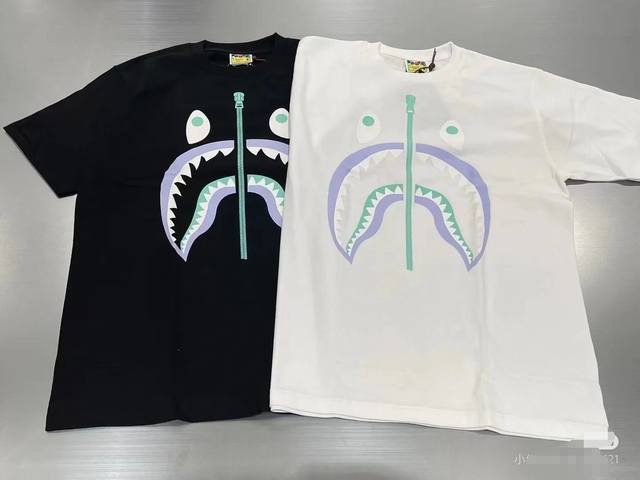 001058 Bape Fw22 shark pattern print round neck short-sleeved T-shirt for men and women, size Smlxlxxl, black and white