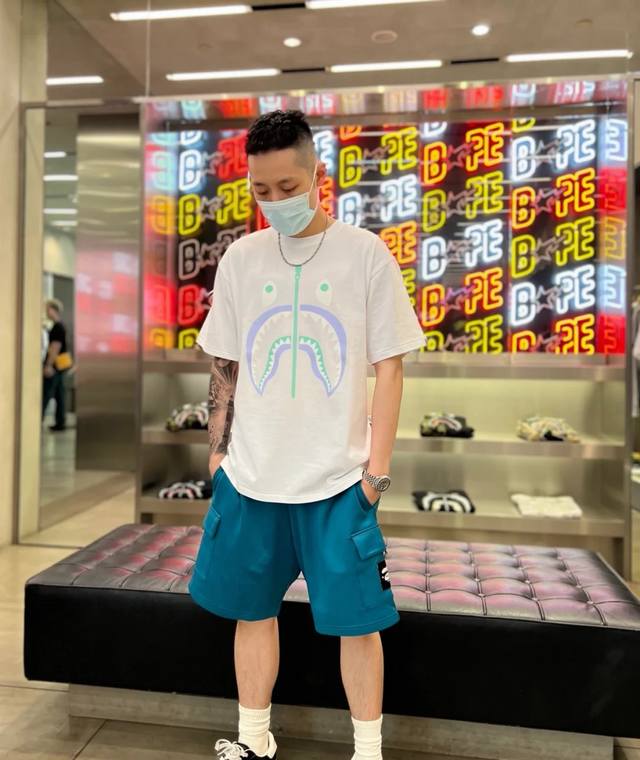 001058 Bape Fw22 shark pattern print round neck short-sleeved T-shirt for men an