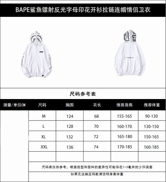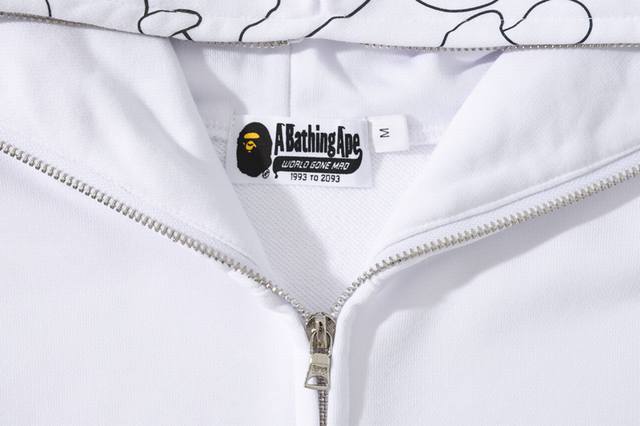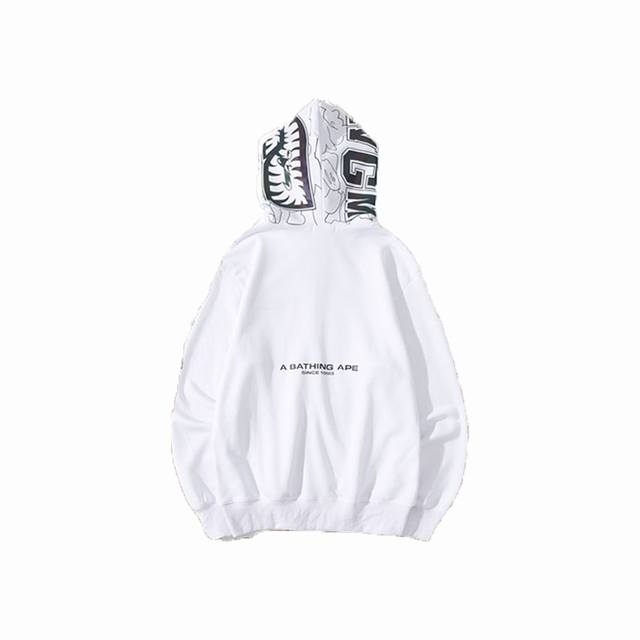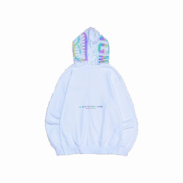 New Arrival! High-Quality Bape Shark Laser Reflective Letter Print Cardigan with Zipper and Hood, Couple Sweatshirt. The shark head design is incredibly trendy and stylish, perfect for anyone to wear. Made with custom-dyed reactive cotton fabric, it won't pill or fade, and the print won't crack or peel! Excellent details, superb fit, unisex style! Colors: Black, White. Sizes: M-XL. Style Number: 6677.