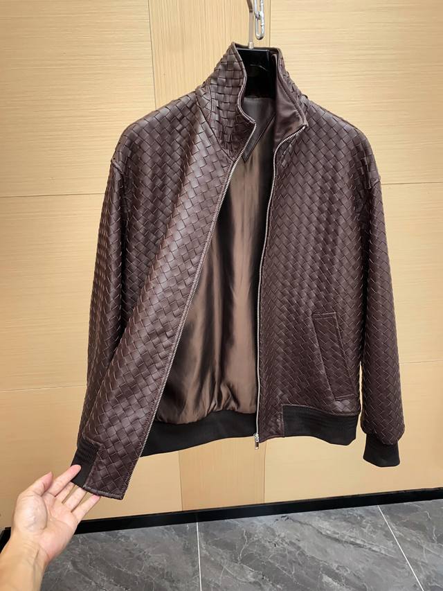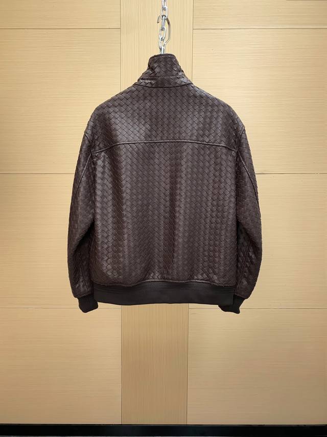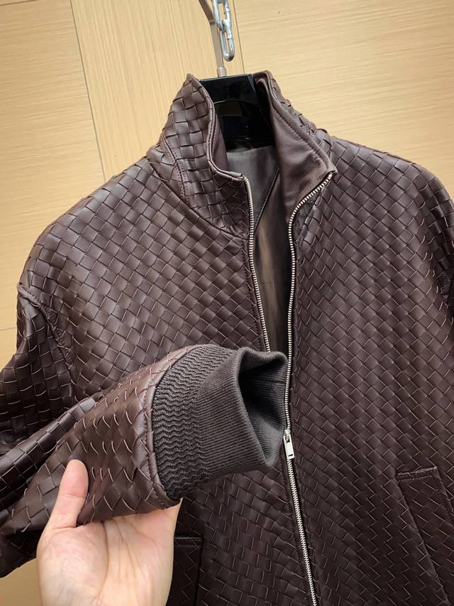 is crafted entirely with Bottega Veneta's signature intrecciato weave, where the leather is cut into thin strips and then meticulously interwoven by artisans. Every grain and every interweaving embodies the brand's unwavering commitment to traditional craftsmanship and its unwavering pursuit of the finest quality. This kind of weaving not only gives the jacket a unique visual beauty, but also brings a soft and resilient wearing experience, combining texture and comfort.