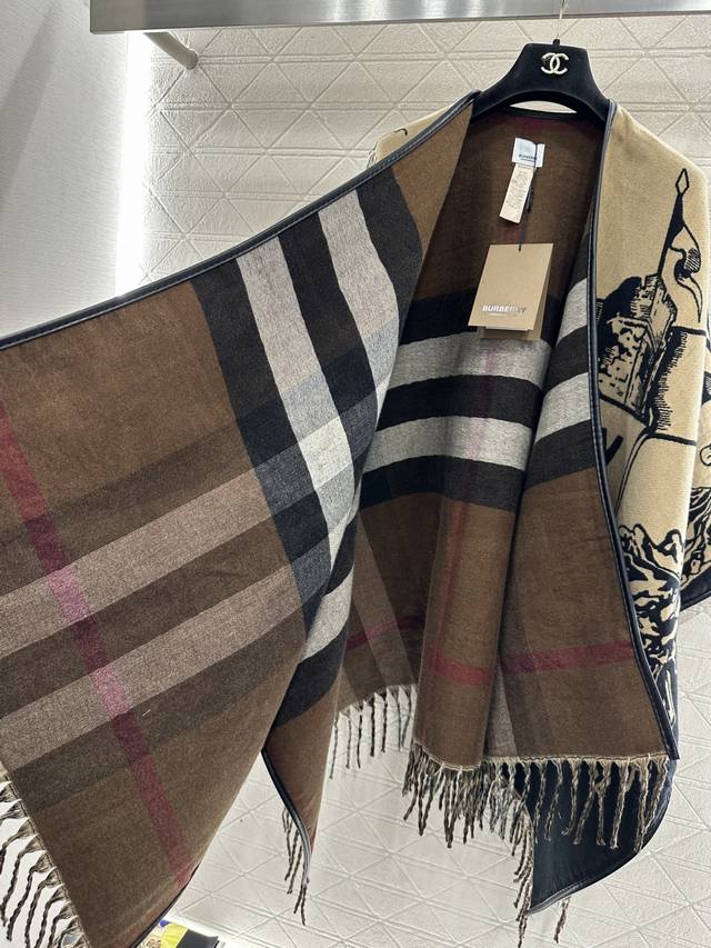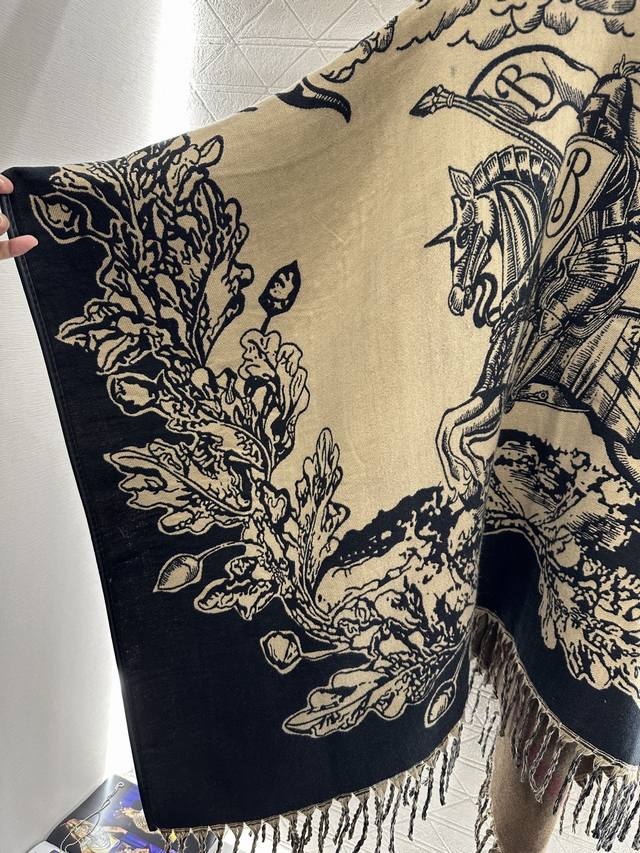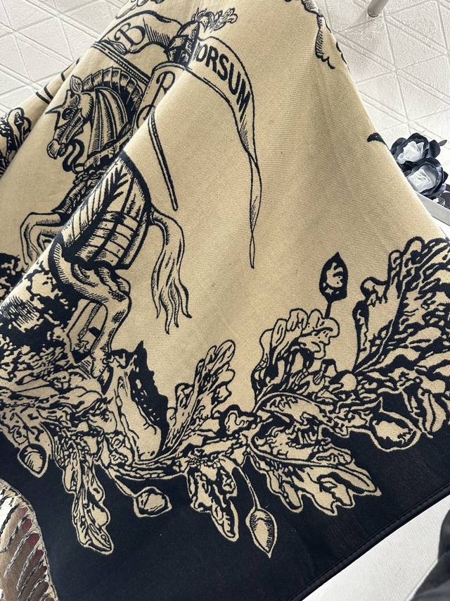 Bbr*2025 New Arrival Ddd Reversible Knitted Tassel Cape Shawl Ddd Made with custom Yb cashmere and wool yarn , this cape-style mid-length cape shawl features a dense knit with draped, off-the-shoulder tassel details, creating a relaxed yet luxurious feel. It offers excellent warmth and wind protection. The reversible design features a classic brown plaid pattern on one side and a horse and flag pattern on the other, showcasing the brand's premium feel. The loose silhouette can also be used as a wide scarf, making it truly versatile and practical. Perfect for everyday wear in autumn and winter, it's simple, stylish, and chic. Custom fabrics and accessories , high-quality version, one size fits all. DDD