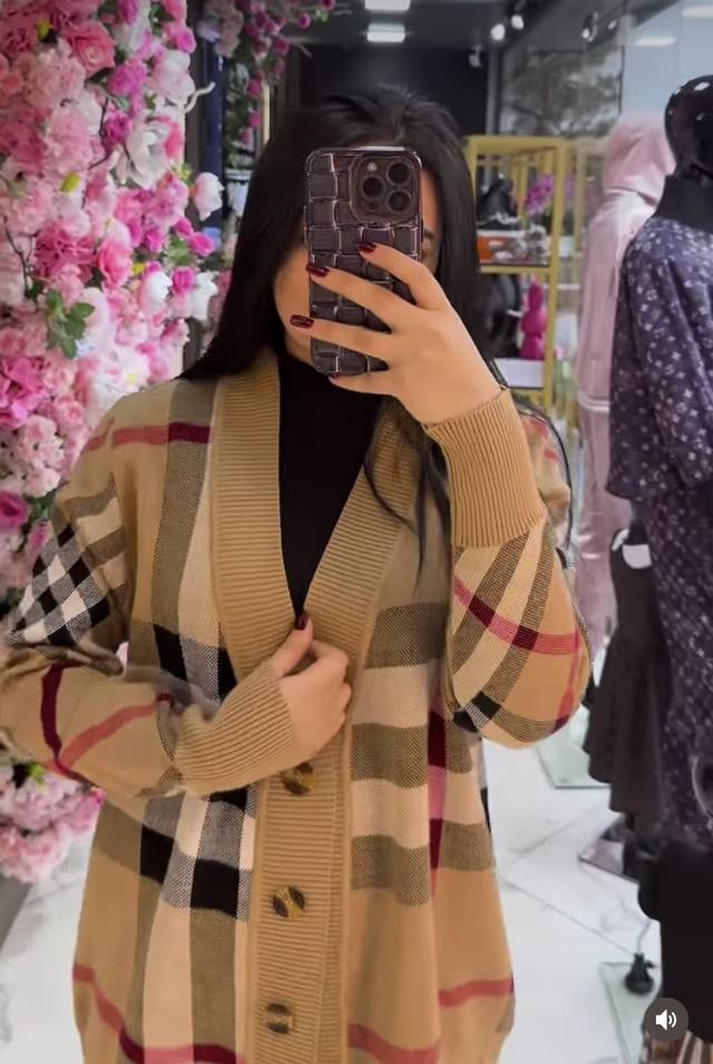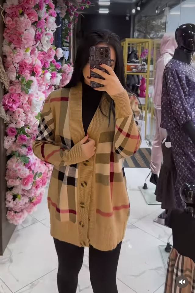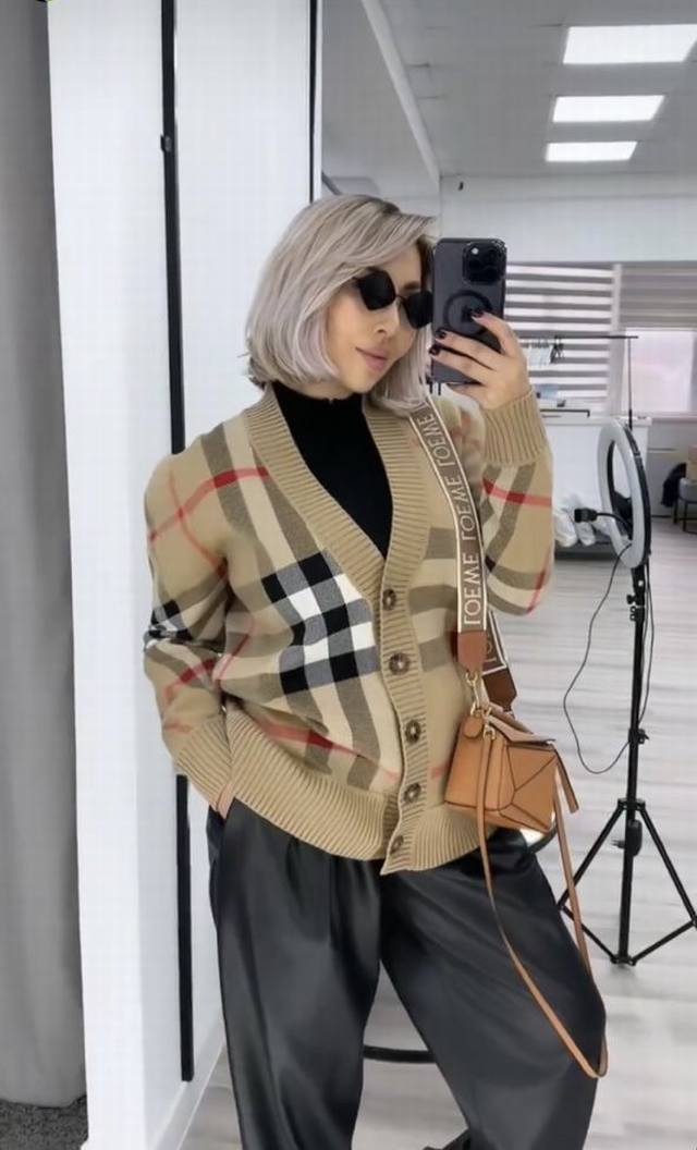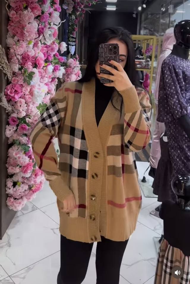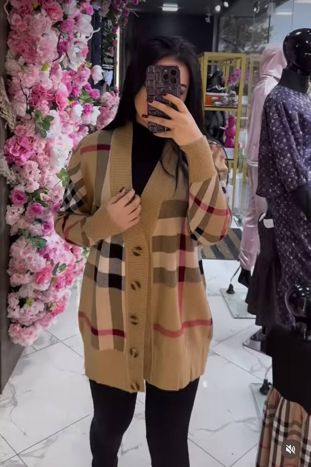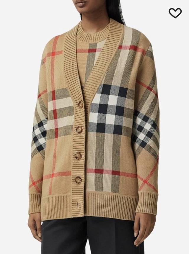 Burberr* New contrast plaid V-neck long-sleeved knitted cardigan, khaki,