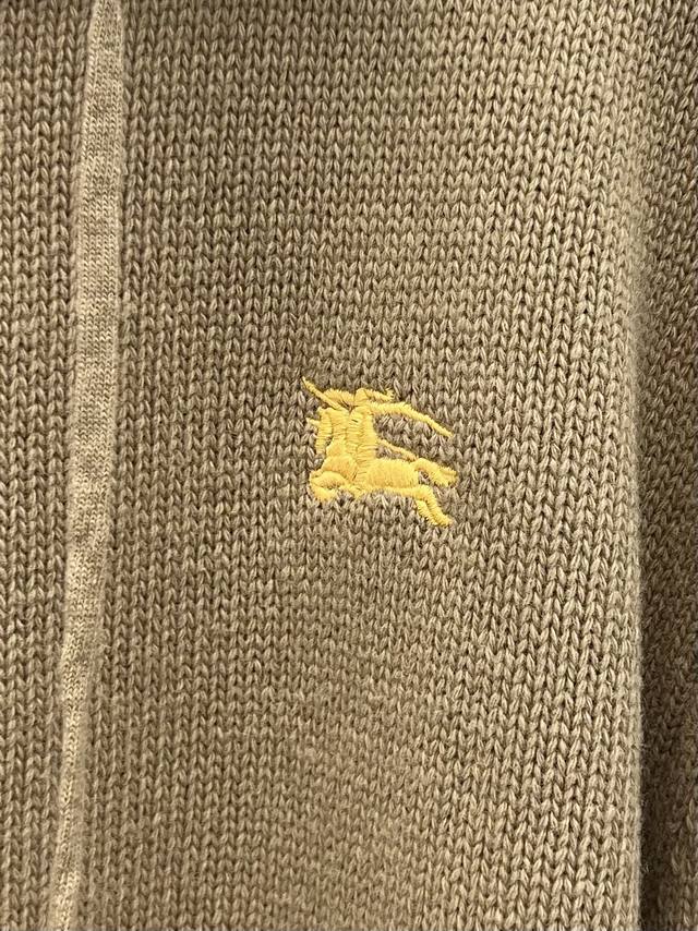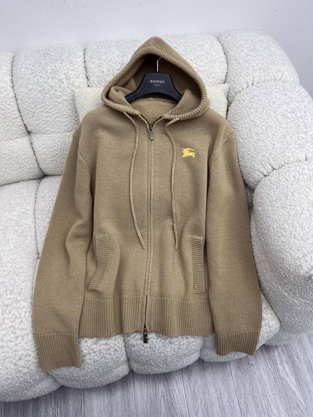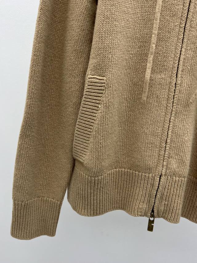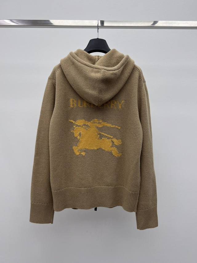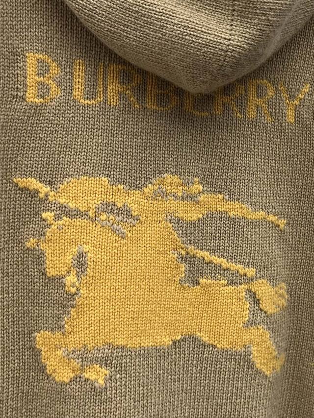 ) Crafted from a lightweight cashmere blend knit fabric. Features a relaxed hooded fit, drawstring, and double-ended zipper details. Adorned with contrasting equestrian rider logo embroidery on the chest and back. (