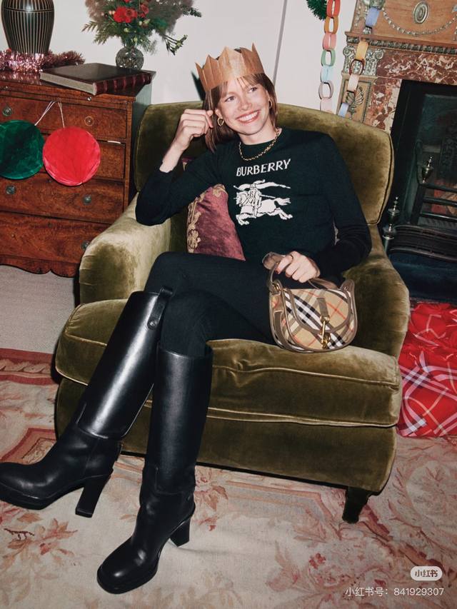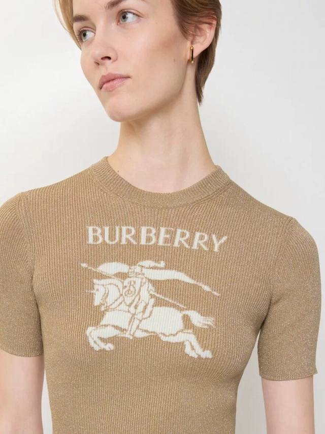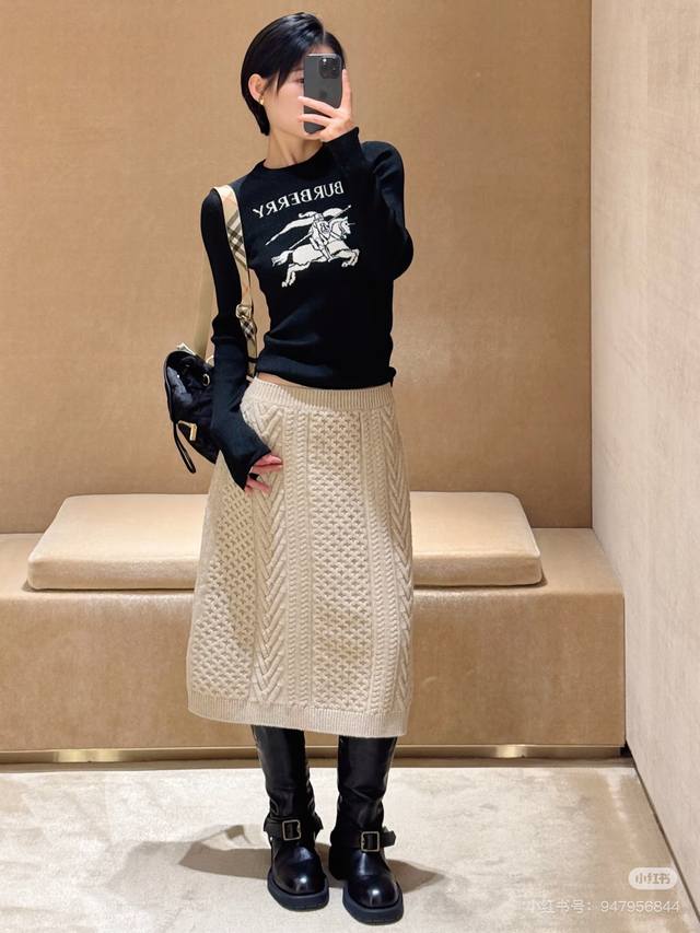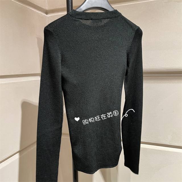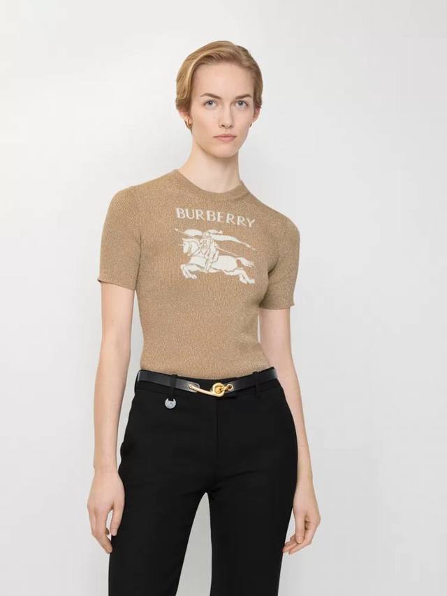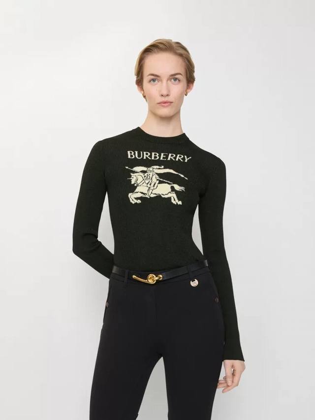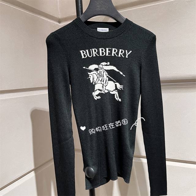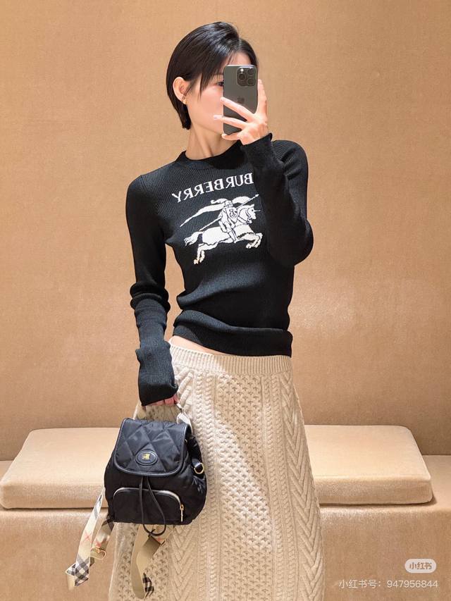 Burberr*New High-End Custom Burberry Classic Knight Horse Pattern Letter Logo Slim Fit Round Neck Long Sleeve Stretch Knit Top! Khaki Apricot, Classic Black, Size M: Bust 70cm, Sleeve Length 59cm, Length 57cm (DDD)