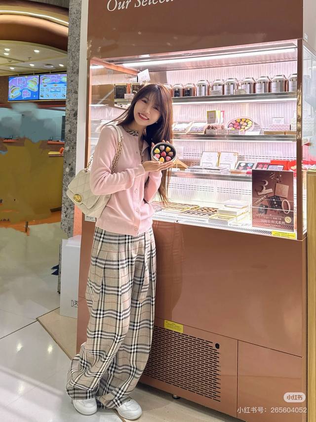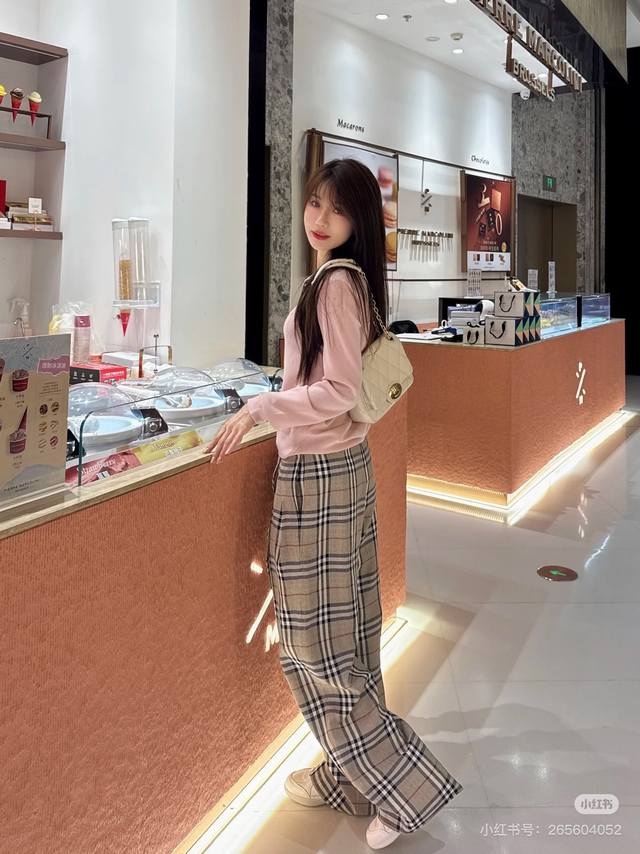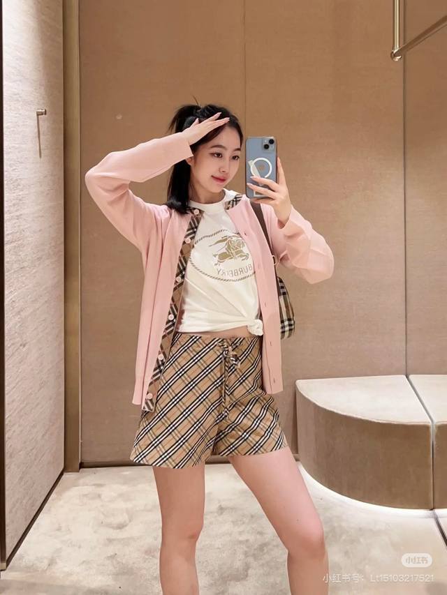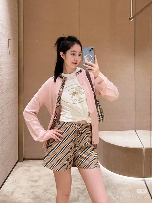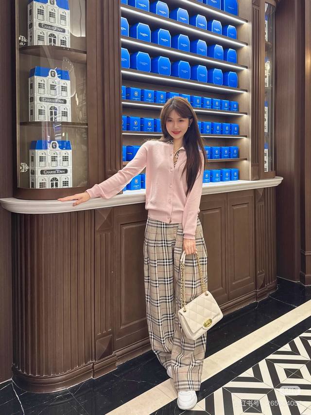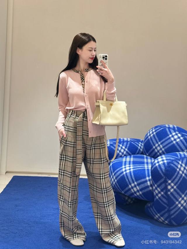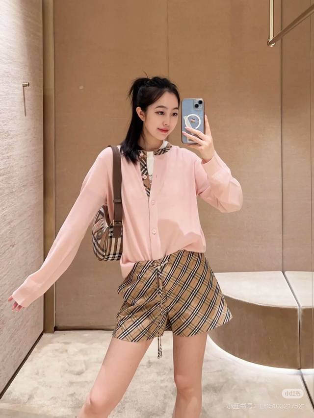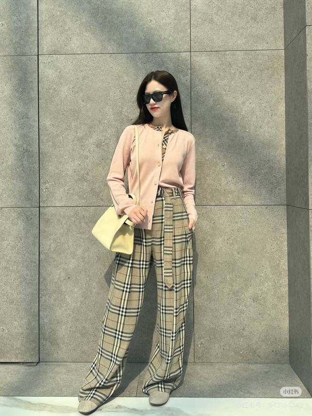 Burberr's new high-end custom 100% Merino wool yarn fabric is soft and skin-friendly! Burberr's classic plaid hemming, buttoned placket, round neck, long-sleeved knitted cardigan top! Khaki, pink, Size M: Shoulder 36, Chest 92, Sleeve 59, Length 58