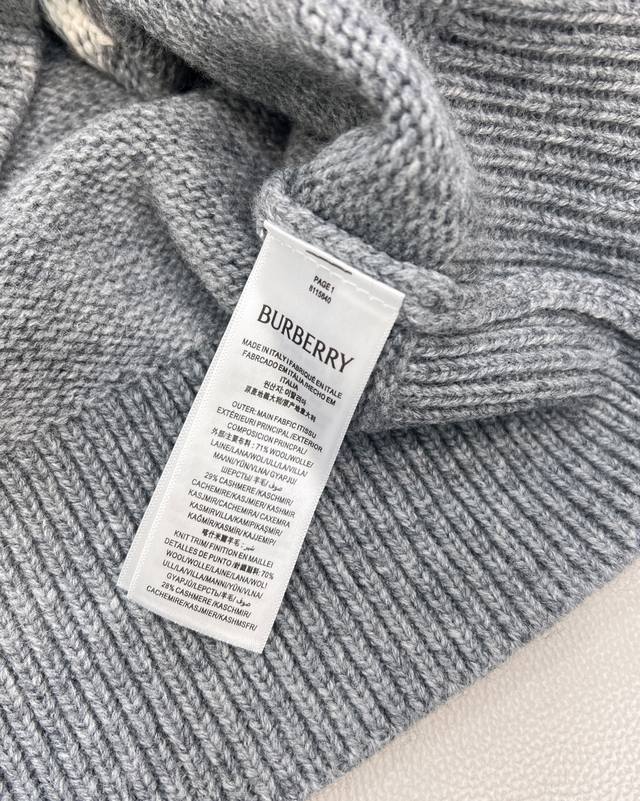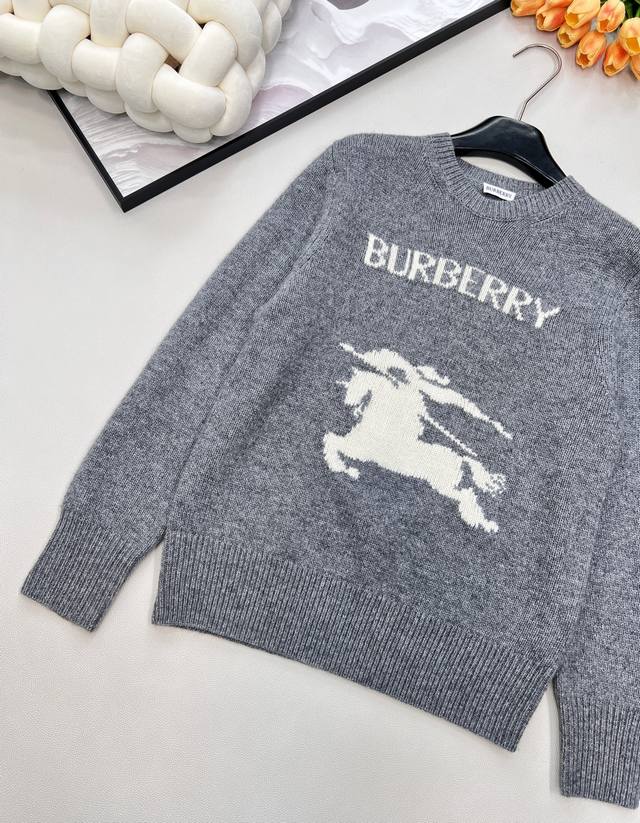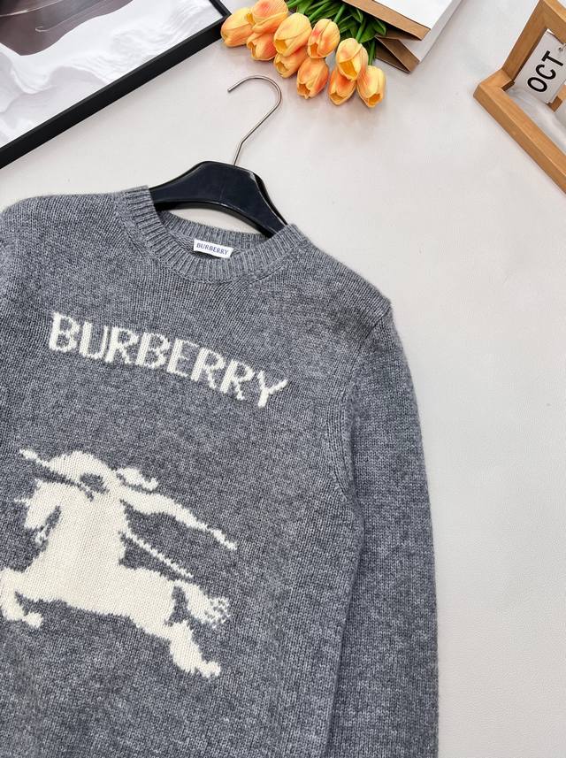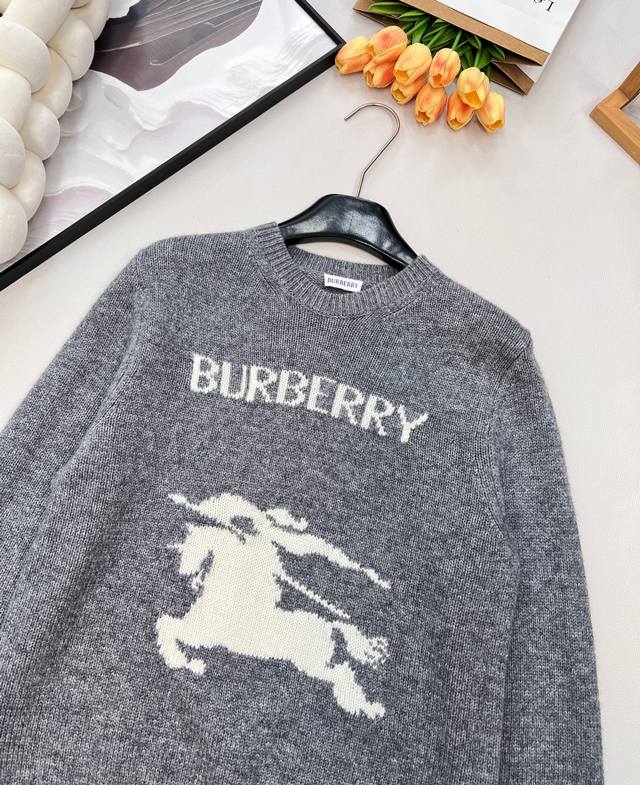 features a prominent knitted "Burberry" monogram logo, ensuring high brand recognition; it is also adorned with a contrasting equestrian rider emblem, a classic and iconic Burberry symbol, showcasing the brand's unique style and rich heritage. The