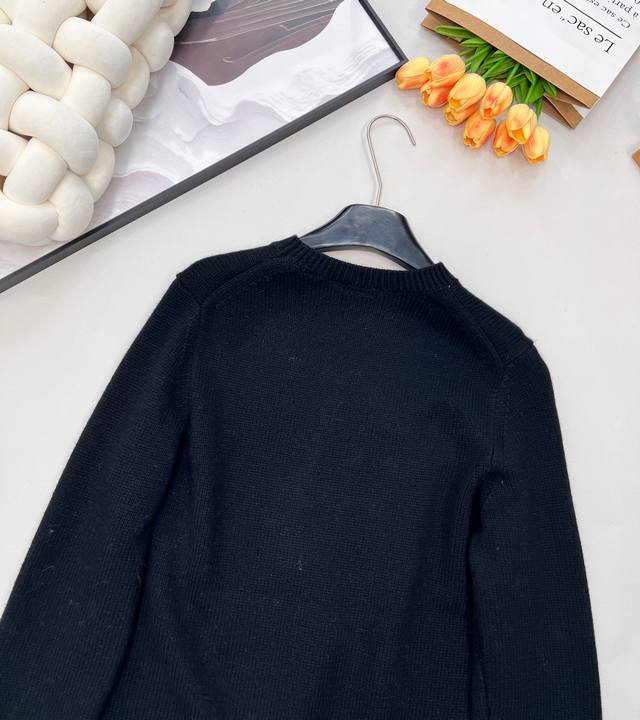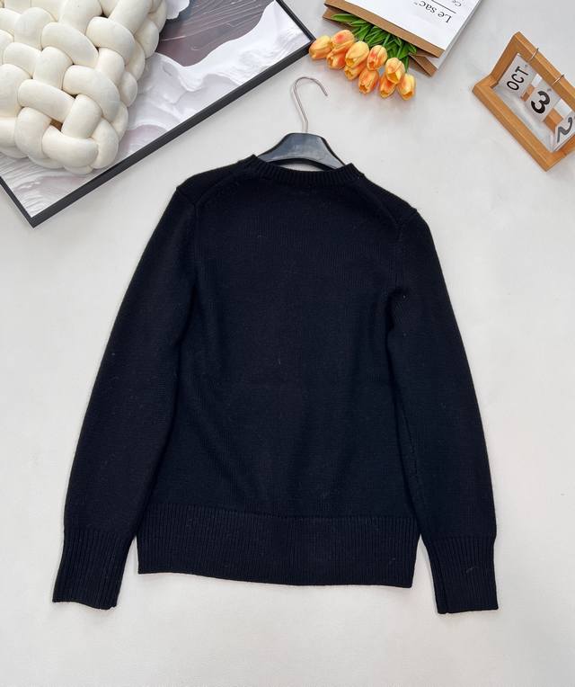 for 10,490. Features the Equestrian Logo on the chest, with the name in bold, legible lettering. Crafted from pure wool using a seven-needle imported knitting machine, this sweater is adorned with contrasting equestrian and brand logos. Made from a wool blend, it offers a stylish and timeless look. A classic and versatile piece, it features a crew neck design, making it easy to pair with various outerwear and adaptable to different occasions. Ribbed knit details at the neckline, cuffs, and hem add dimension and detail, while also providing a flattering fit, warmth, and shape retention. The front of the