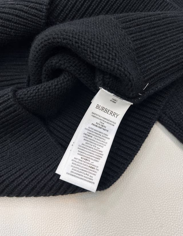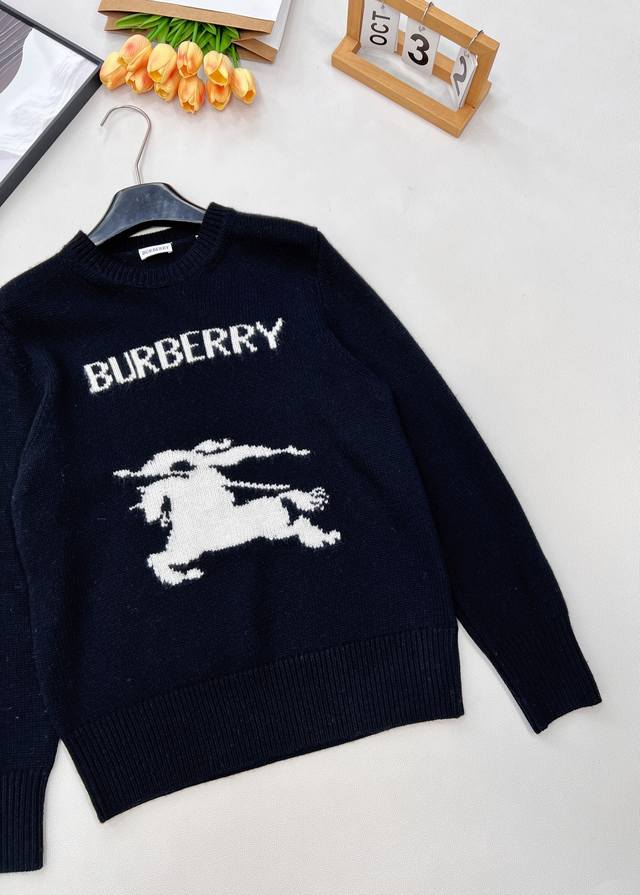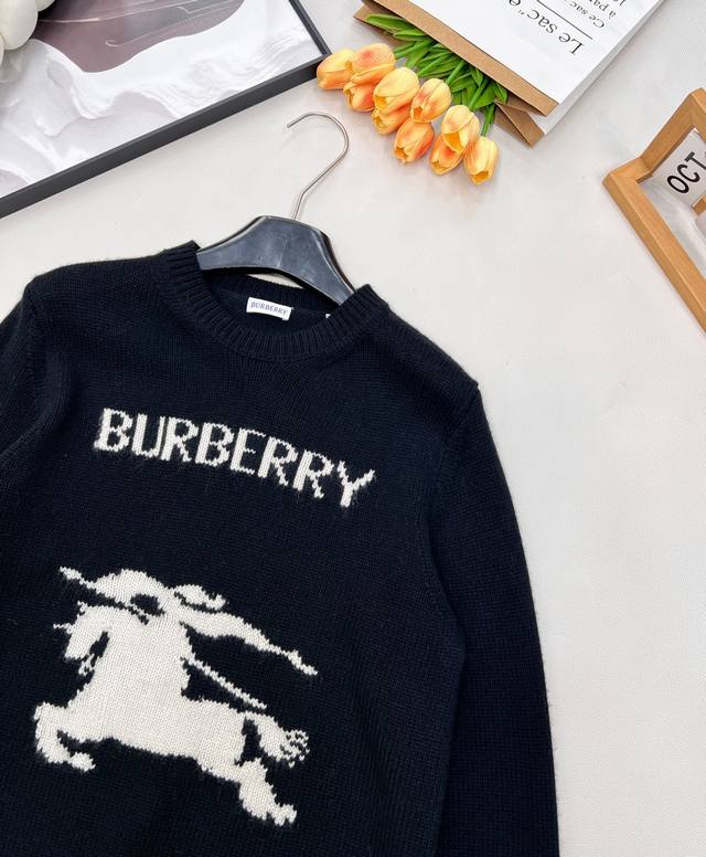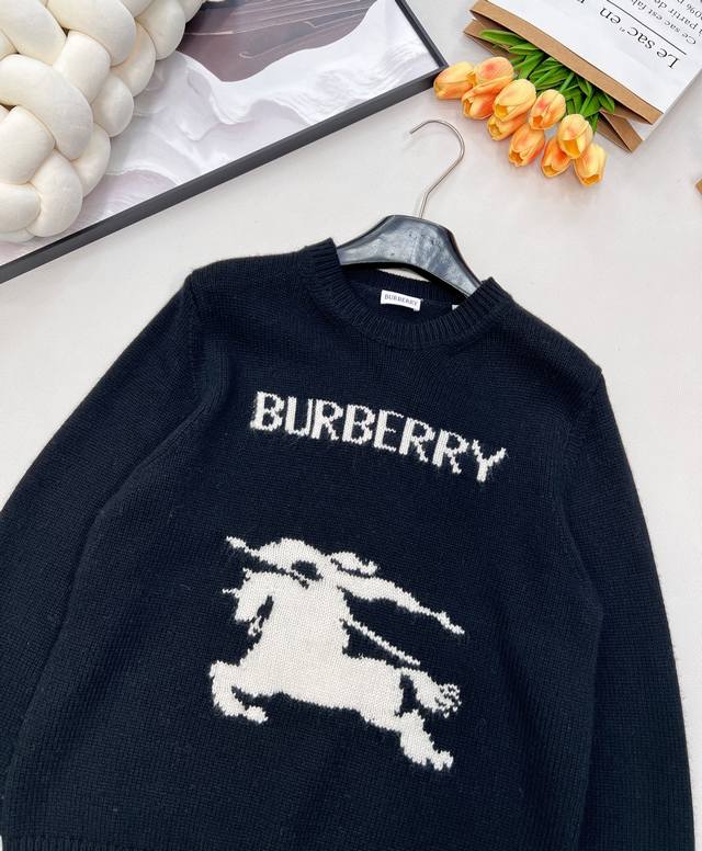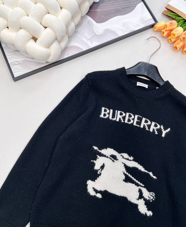 features a prominent knitted "Burberry" monogram logo, ensuring high brand recognition; it is also adorned with a contrasting equestrian rider emblem, a classic and iconic Burberry symbol, showcasing the brand's unique style and rich heritage. The