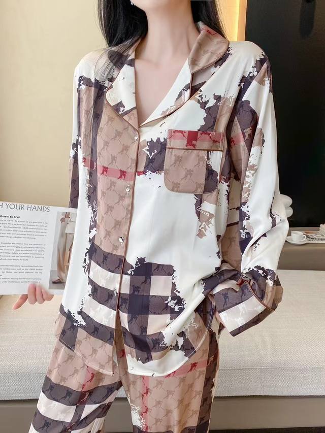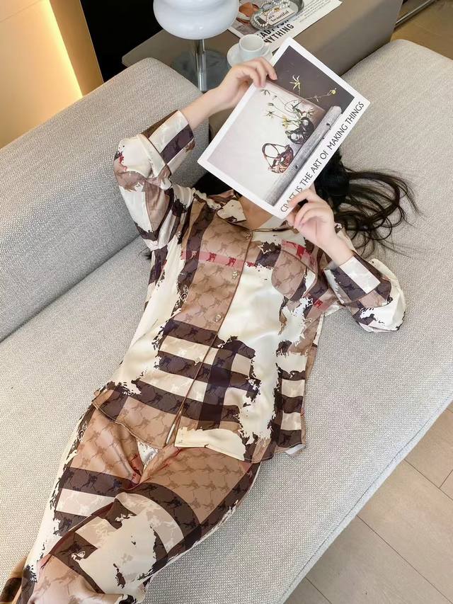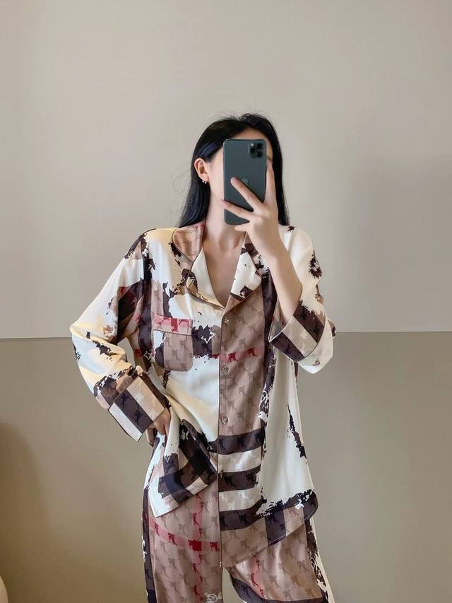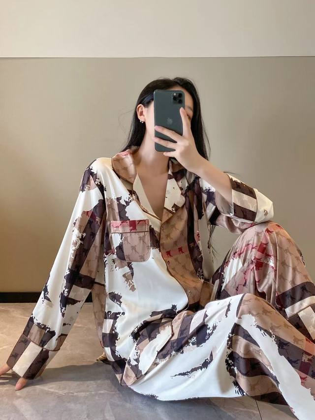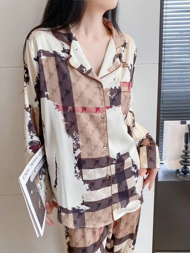 Burberry New Autumn/Winter Pajamas Original High-End New Product Pajamas Casual 2-Piece Set Long Pants Long Sleeves Imported Silk Satin Fabric Lined Edges Soft to the Touch Super Cool Super Beautiful Super Comfortable Elegant and Luxurious Style Can Also Be Used as a Fashionable Casual Set Extremely Fashionable Blending Fashion and Exquisite Style Loved by Many Celebrities M L X L D D