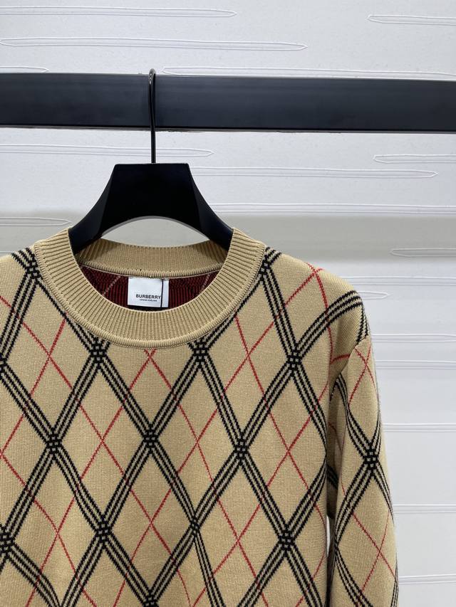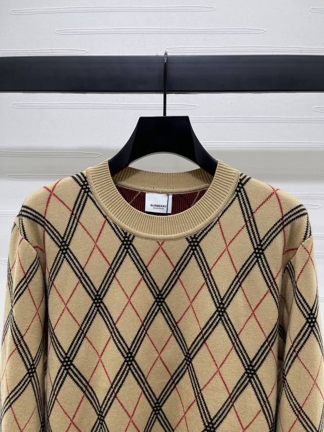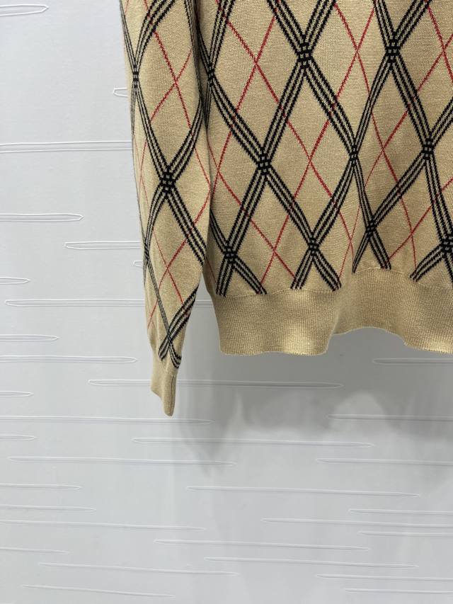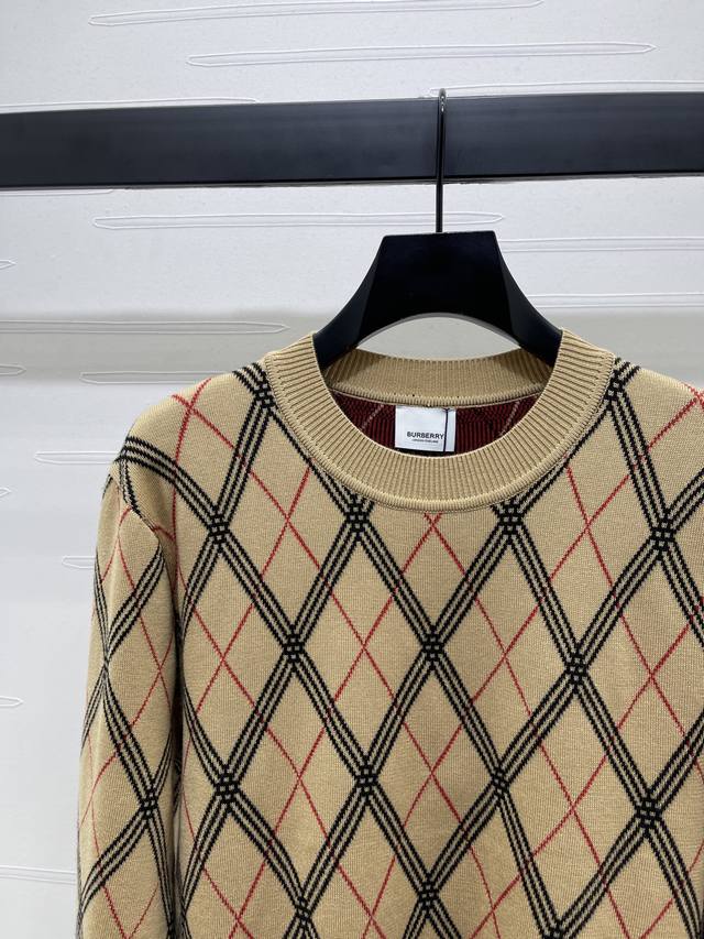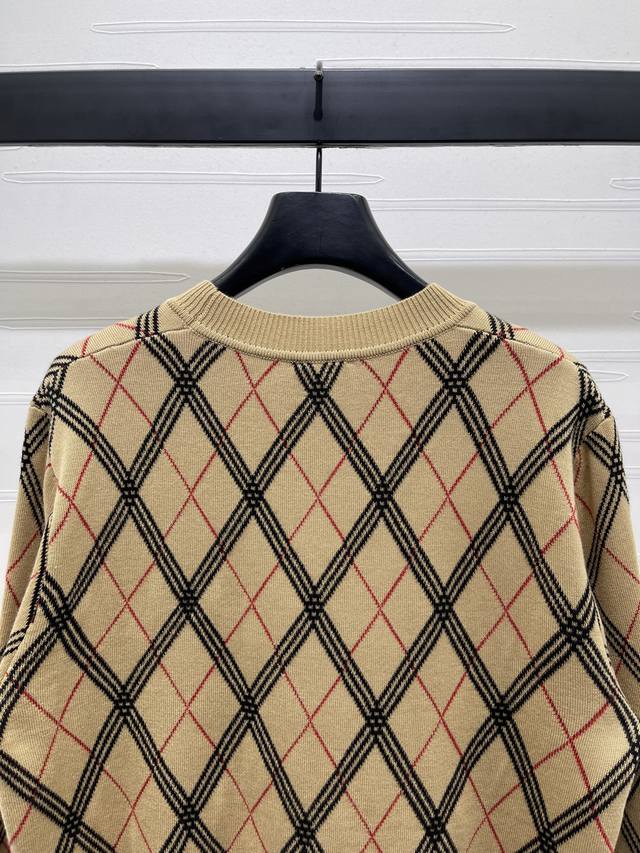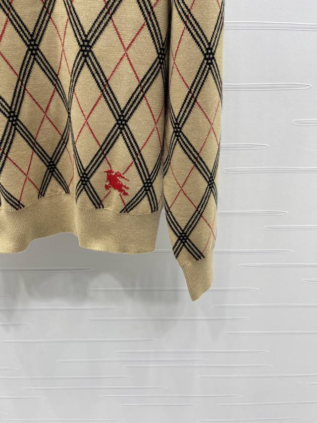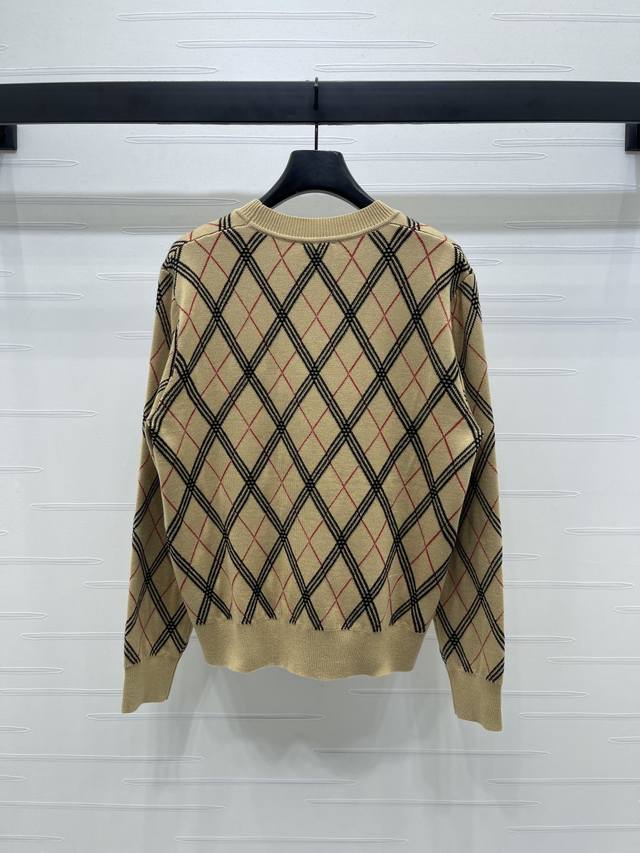 New, original, high-quality Burberr* from the latest 2025 Early Fall collection! Diamond-quilted crew-neck pullover sweater! Crafted from custom wool yarn, this top is soft and comfortable. The round neckline and long sleeves are knitted with contrasting collar and cuffs. The spiral hem is detailed and soft, with a contrasting, preppy look. The diamond pattern adds a youthful touch, while the warhorse logo on the hem highlights the brand's artistic style. The color combination exudes British charm. A must-have for commuting! 2 colors! Sizes SM-L3! High-quality, bulky stock A706B310C