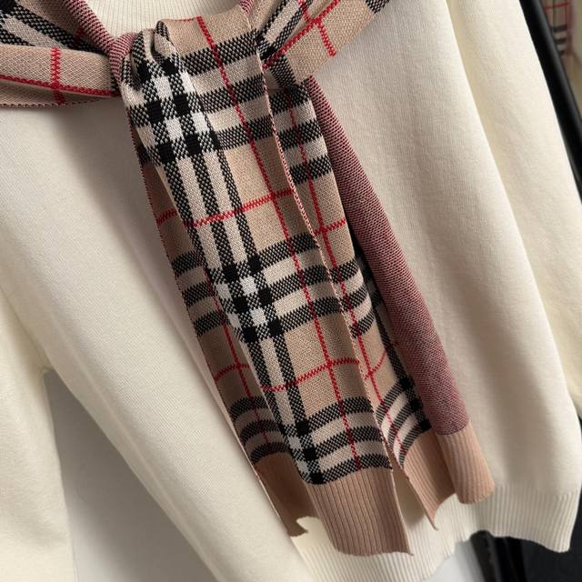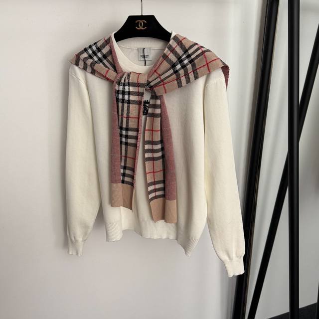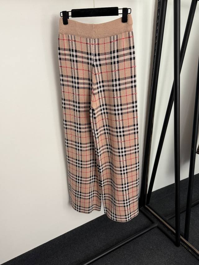 Style No. 20256884 Burberr* New Knit Set: Plaid scarf/neck warmer pullover long-sleeved knit top + plaid knit wide-leg trousers, available in white, khaki, and black. One size fits all: shoulder width 43cm, bust 106cm, sleeve length 56cm, length 57cm; waist 64cm (elastic), length 107cm; weight: 1.035kg. (