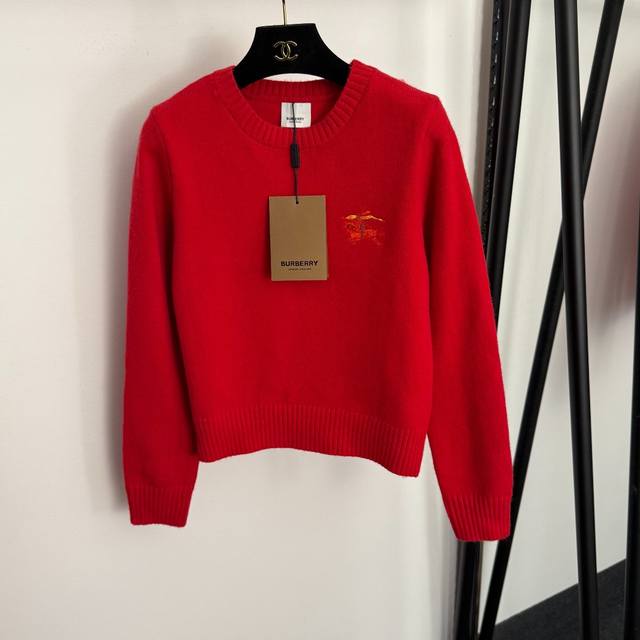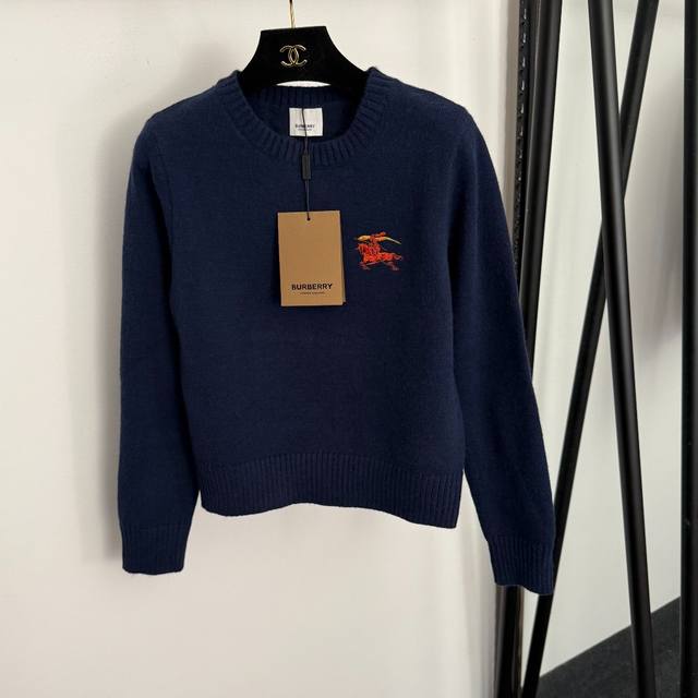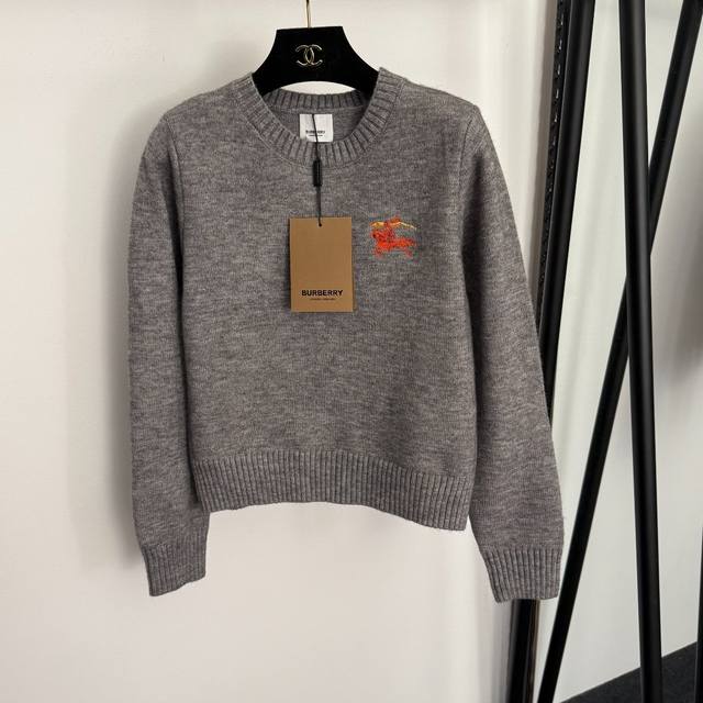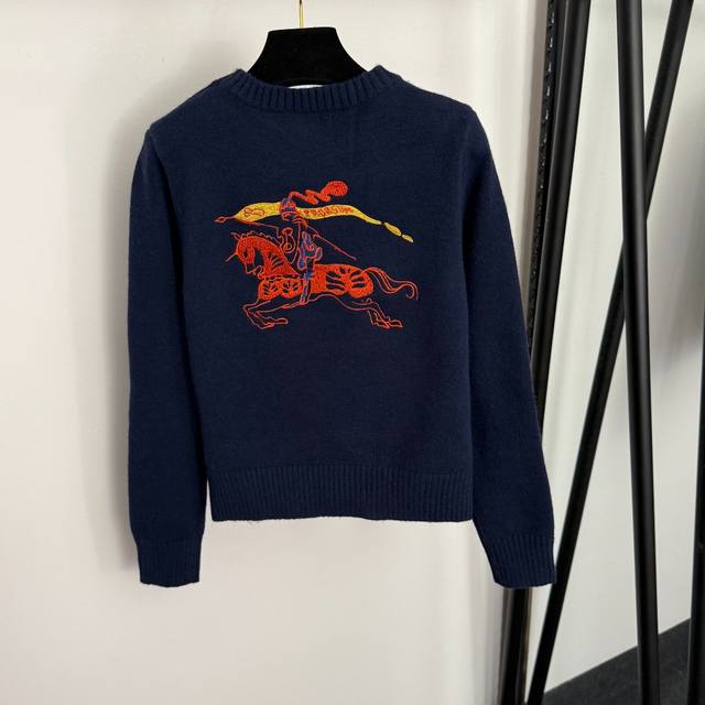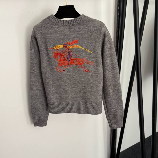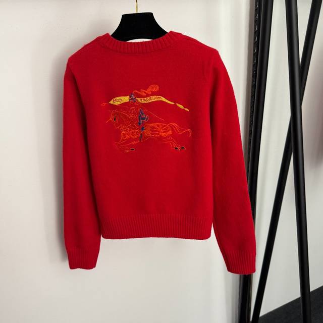 Style No. 20258318 Burberr*New style long-sleeved pullover knit sweater with embroidered equestrian knight on the front and back, available in white, red, grey, and blue. One size fits all: shoulder width 36cm, chest 90cm, sleeve length 61cm, length 53cm; weight: 0.325kg. DDD