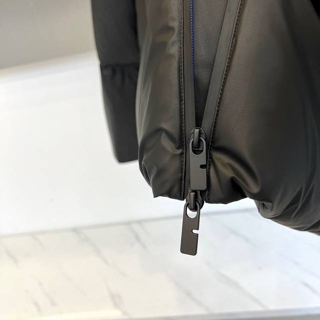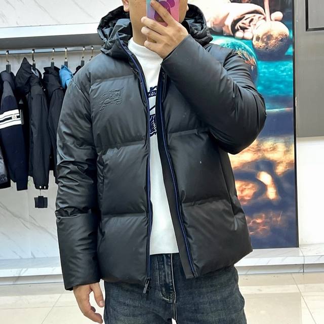 Burberry, 2025 Fall/Winter New Arrival: Burberry Knight Badge Down Jacket. This black down jacket features a stand-up collar with a smooth zipper closure and the brand's iconic knight badge embroidered on the left chest. Precise diamond quilting secures the 90% white duck down filling, ensuring lightweight warmth. Two slanted pockets are adorned with metal zipper pulls. The outer fabric is windproof, while the lining is a 98% cotton and 2% nylon blend for breathability and comfort. The label indicates convenient care with a 30