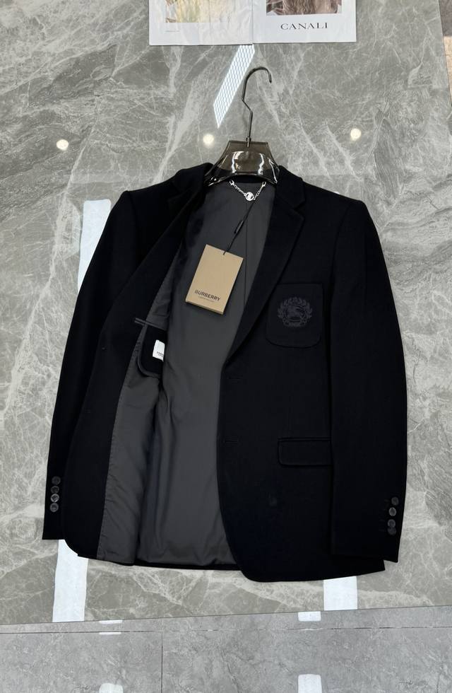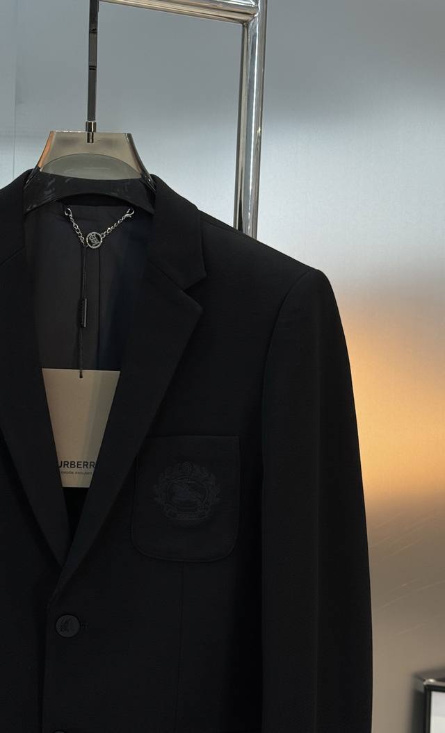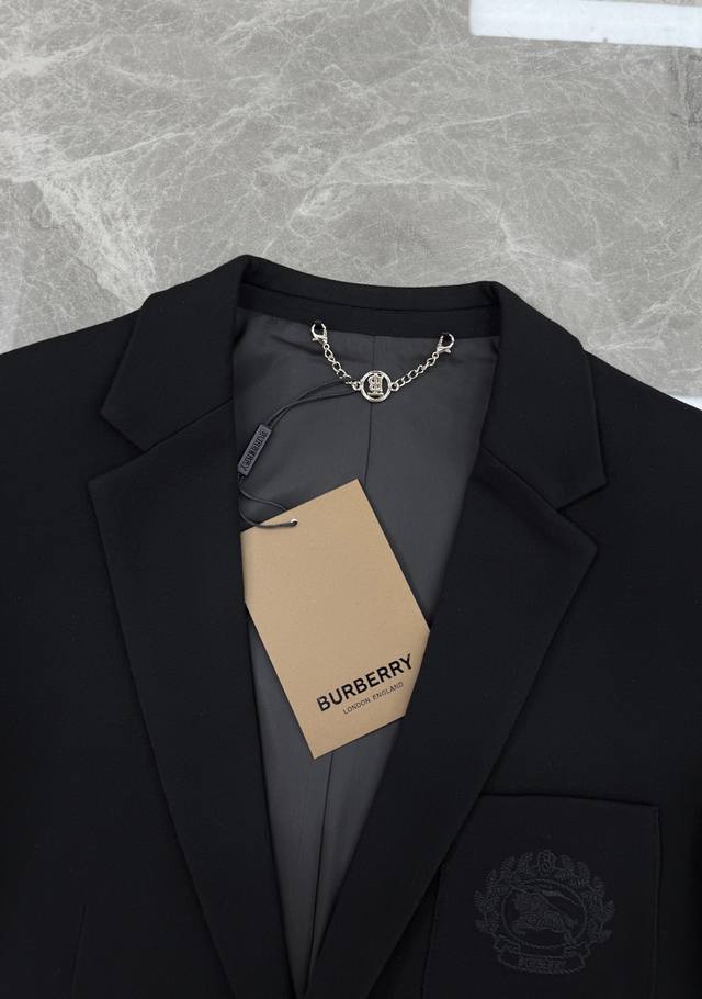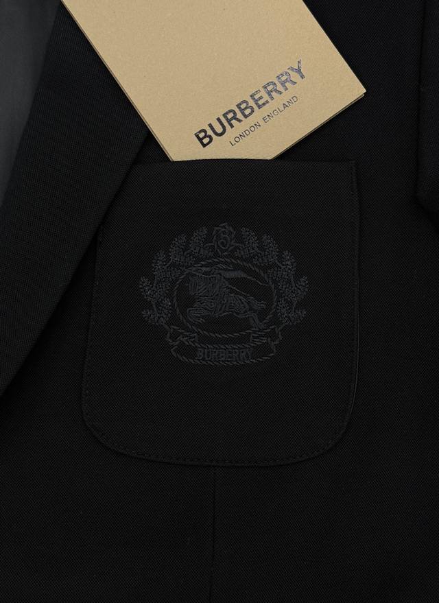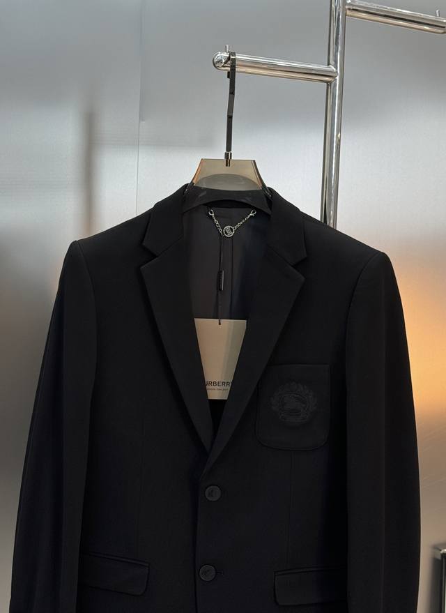 Burberry Black Badge Suit Jacket, classic black with badge embroidery, full of British style. Sizes: M-3XL, slim fit, 4XL, custom orders accepted. For someone 175cm tall and weighing 145kg, XL is recommended.