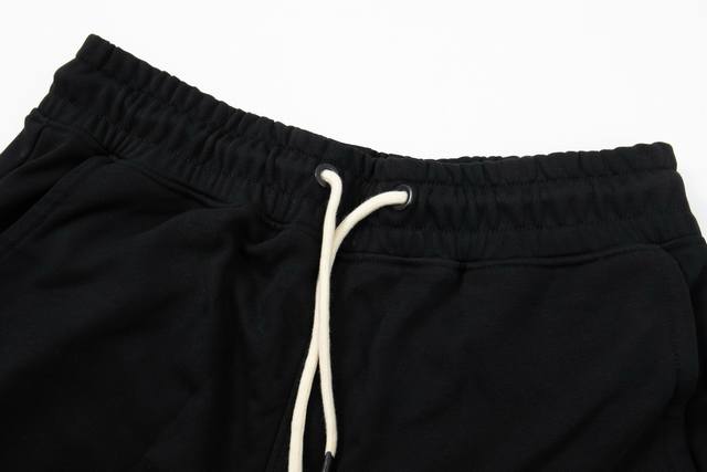Elastic waistband, black and white drawstring design, custom drawstring pockets, slant pockets on both sides, and a small pocket on the back