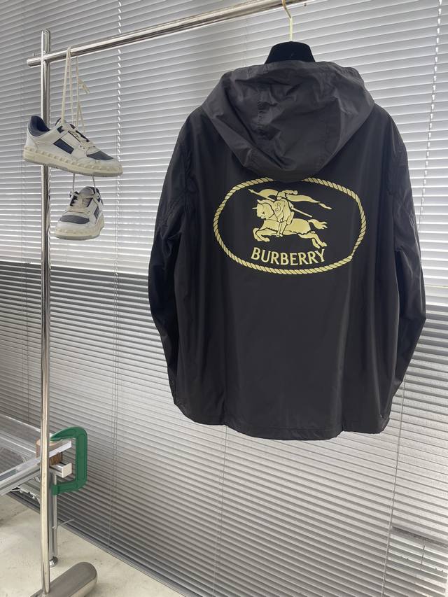 Bbr 2025 Spring/Summer New Men's Equestrian Rider Logo Nylon Windbreaker Jacket. Features a distinctive equestrian rider logo print on the back, laser-cut details, a relaxed fit, a B-shaped zipper pull, a two-way zipper closure, a drawstring hood and hem, side zipper pockets, and elastic cuffs. Made of nylon for both the outer and inner layers. All tags are included! Unisex. Sizes: M-3XL.
