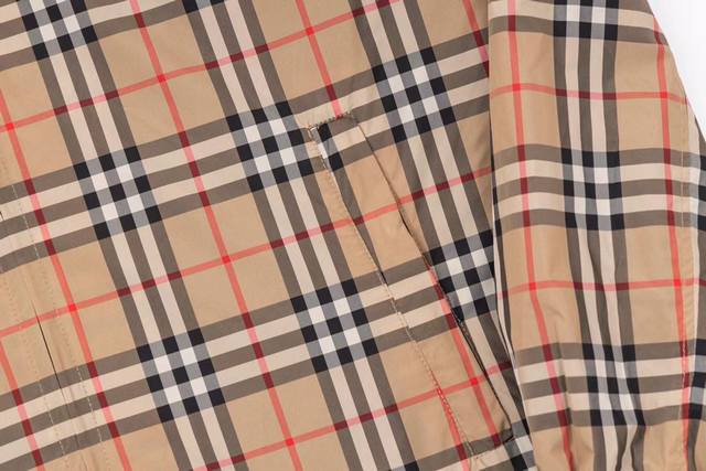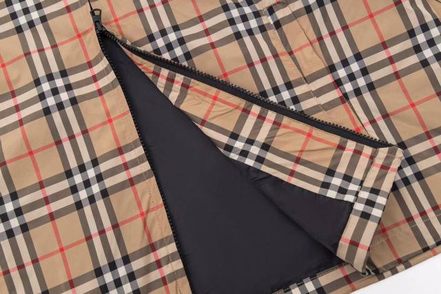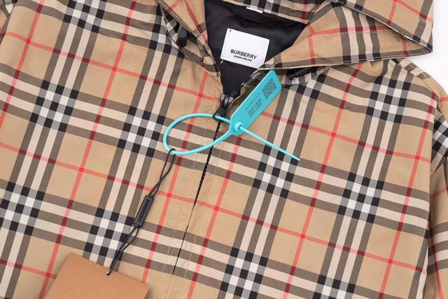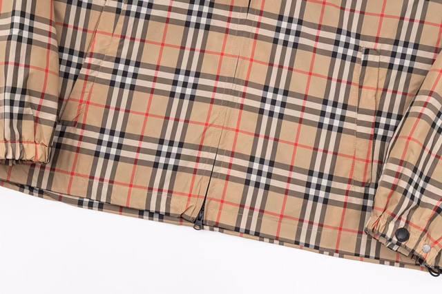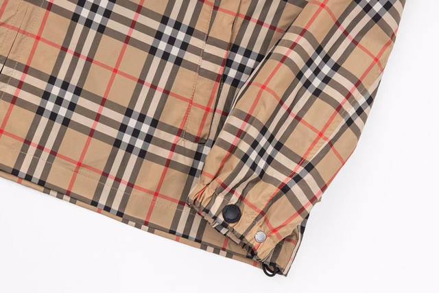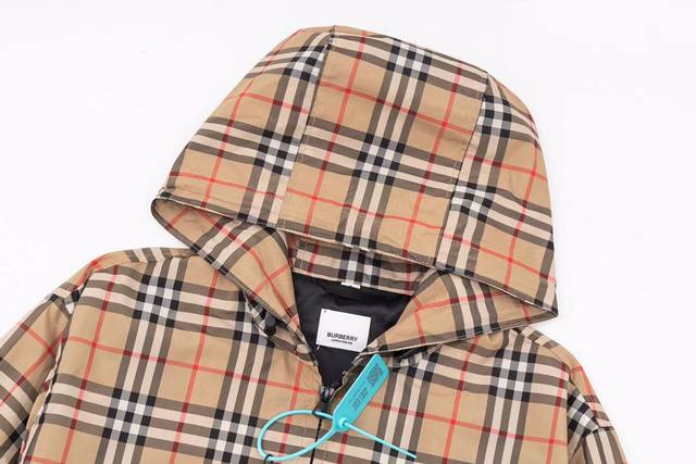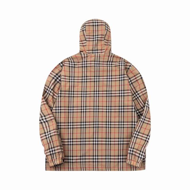 Bbr 23Ss Spring/Autumn New Classic Plaid Striped Hooded Windbreaker Jacket. The fabric is made from custom-supplied recycled polyester fiber, making it soft, lightweight, and completely different from ordinary polyester fibers. It's comfortable and breathable, perfect for summer sun protection or autumn wind protection. Versatile design with classic plaid pattern. Features double zipper closure, zippered patch pockets on both sides, and elastic snap cuffs. Classic and full British style. Original custom-made hardware zippers, letter logo, double zipper closure. Sizes: Xs, SML, DDD