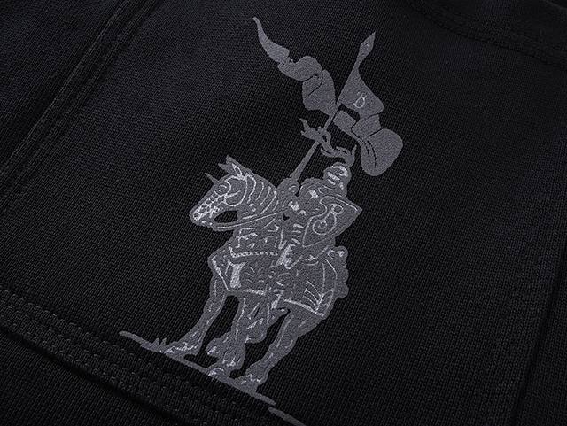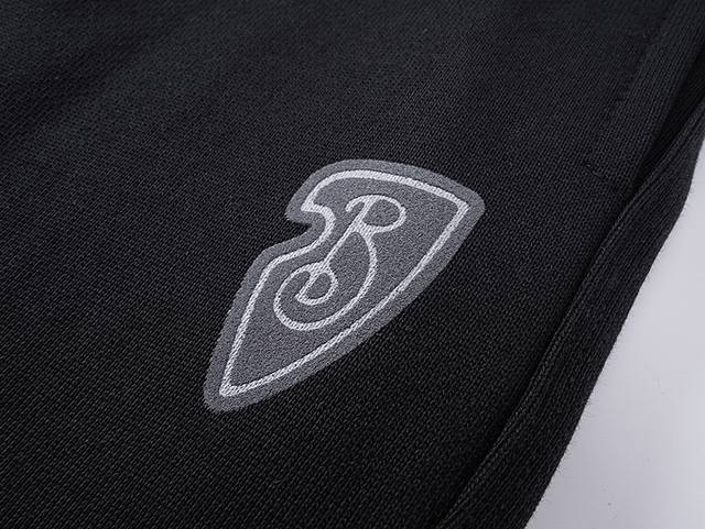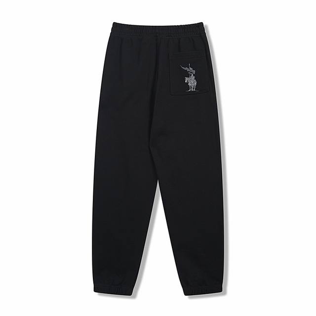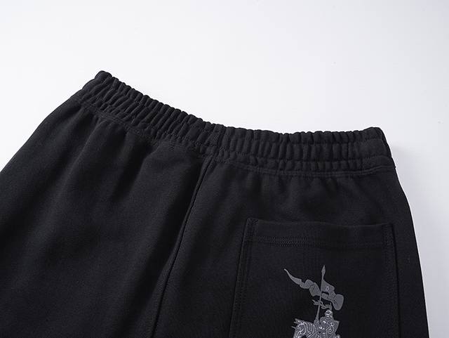 Bbr 25Ss Shield and Horse Print Casual Trousers (Ddd 420G) Made of fleece cotton fabric, featuring an elastic waistband with drawstring adjustment. The print uses a plastisol foam printing technique to create a B-shaped shield logo, and includes an equestrian knight emblem on the back. The printed pattern has a distinct three-dimensional effect after heating and expansion. The elastic waistband and hem are stitched using a three-needle, five-thread technique. Side pockets are located on both sides, with looped edges. The hem is fitted with flat elastic. Sizes: S, M, L, XL, DDD