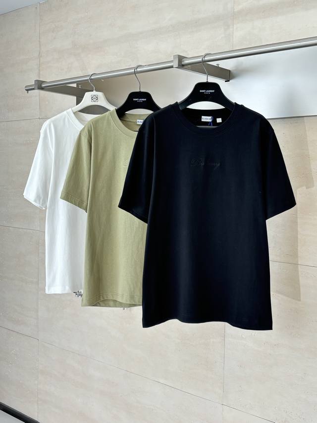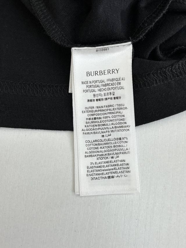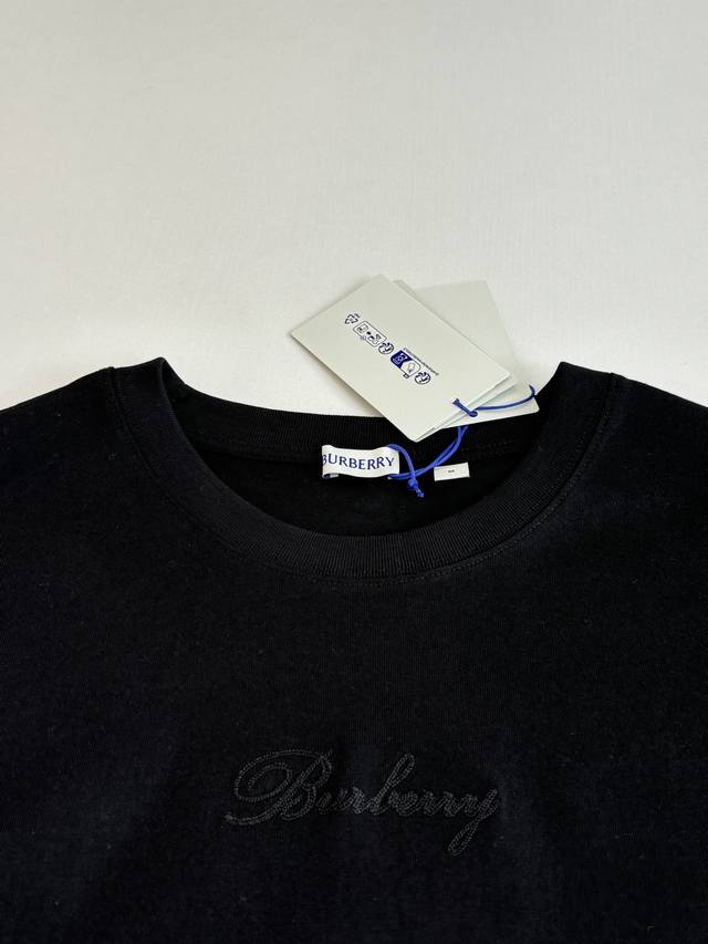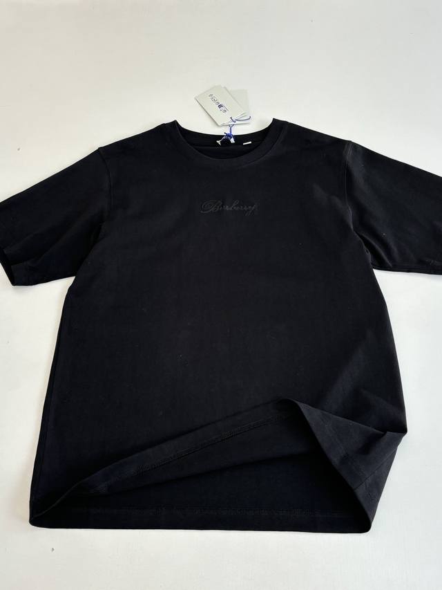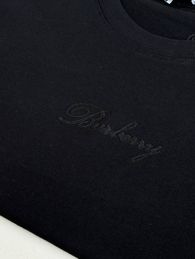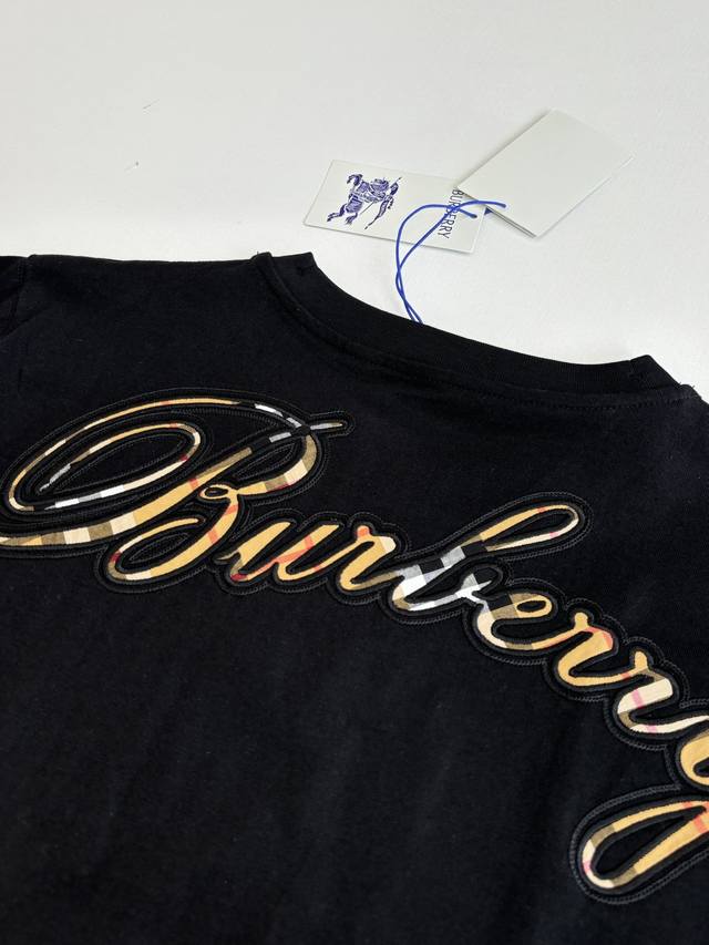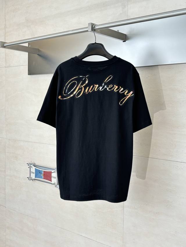 Burberr* Burberry Checkered Crew Neck Short-Sleeve T-Shirt with Embroidered Letter Back. Made of 15S fine cotton plain weave, white 230g, black 310g; paired with 32S double-yarn stretch ribbing, 300g. The pure cotton plain weave fabric has a tight structure, giving the fabric a crisp feel and excellent durability, while retaining the natural breathability and skin-friendly properties of cotton. Plain weave fabric is not easily deformed, avoiding an overly loose and casual feel, and providing a more streamlined silhouette. The front and back are adorned with embroidered letter logos using a chain stitch embroidery technique, creating a visually rhythmic effect. These logos are also embroidered with high precision, ensuring clear edges and durability. The unique embroidery technique features interlocking stitches like chains, resulting in a stronger three-dimensional effect, a softer touch, and a unique textured sheen. Size: SML XL