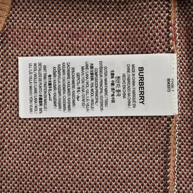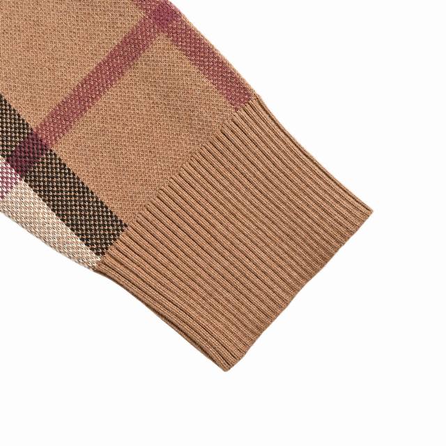 ). Made of 51% polyester and 49% wool, with embellishments of 98% wool, 1% elastane, and 1% polyamide. Utilizing custom-dyed 28-count khaki wool yarn, all materials are consistent and synchronized. The fabric is supple, drapes beautifully, and has a resilient feel. The delicate and soft touch, along with the fine and thick knit, provides an excellent wearing experience. The jacquard pattern is meticulously replicated from the original design, taking half a cycle to reproduce the basic effect. The non-recurring pattern design features a fully computerized flat knit sesame-pattern jacquard. The 12-needle, 4-color sesame dot weave technique results in a garment with a clear texture and exquisite, delicate plaid pattern. The side jacquard is precisely aligned with the original pattern, ensuring a seamless transition. The meticulous stitching process leaves no room for error, with a rigorous plaid alignment process. The plaid is aligned from the body, sleeves, front, and back panels, with the cuffs and hem knitted separately and then joined. There are no deviations in the plaid pattern