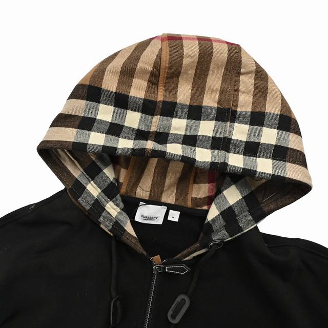 Burberry 23Fw Checkered Hooded Zipper Hoodie Jacket. Developed from the original design, using Burberry's custom hoodie fabric. Features a contrasting flannel checkered hood with leather accents at the drawstring. The surface has been treated for a premium feel. The checkered fabric is 100% coarse cotton with a high yarn count and a thick feel. It features 1x1 pure cotton ribbed fabric. The ribbed fabric is dyed to match the body color. The checkered fabric in the hood is quilted, not a single layer! The checkered spacing and colors are customized 1:1 to the original. Each hood is identical, with symmetrical stripes on all sides. This required exceptional tailoring skills, time-consuming, labor-intensive, and material-intensive. The flannel material is a special material for this year. The drawstring features a five-piece set on one side, including a leather ring, brass eyelet tag, bell, and zipper, replicating the original design. It is embellished with leather trim. Size: S-XL.