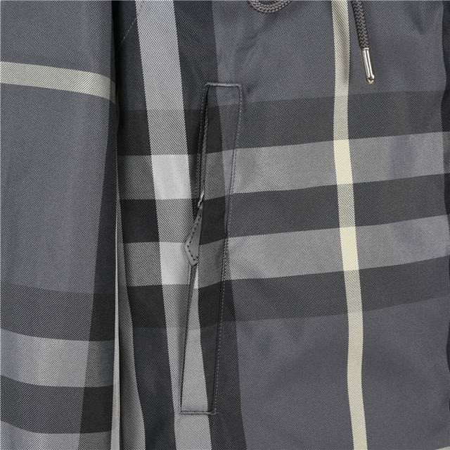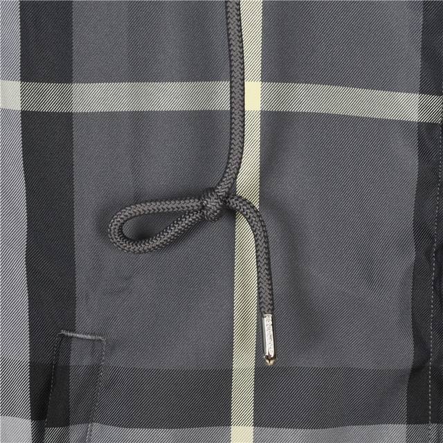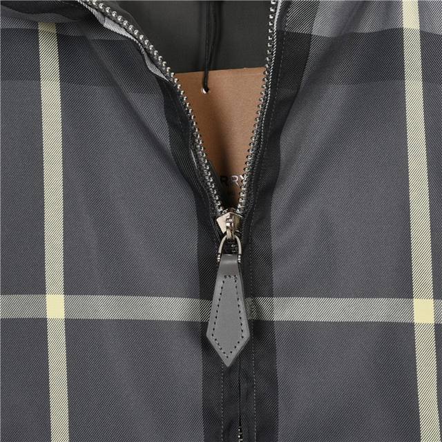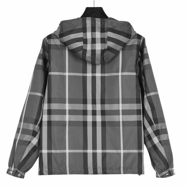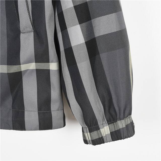 Burberry 23Ss Reversible Hooded Check Jacket. The A-side features a solid color design, crafted from lightweight Econyl material for a light, comfortable, and textured feel. The B-side is made from an Italian fine-spun check cotton blend fabric, with each seam meticulously stitched to match the check pattern, resulting in a casual fit. The sleeves are adorned with the brand's logo, and the hardware accessories are exquisitely crafted. Colors: Khaki, Grey. Size: S-XL.
