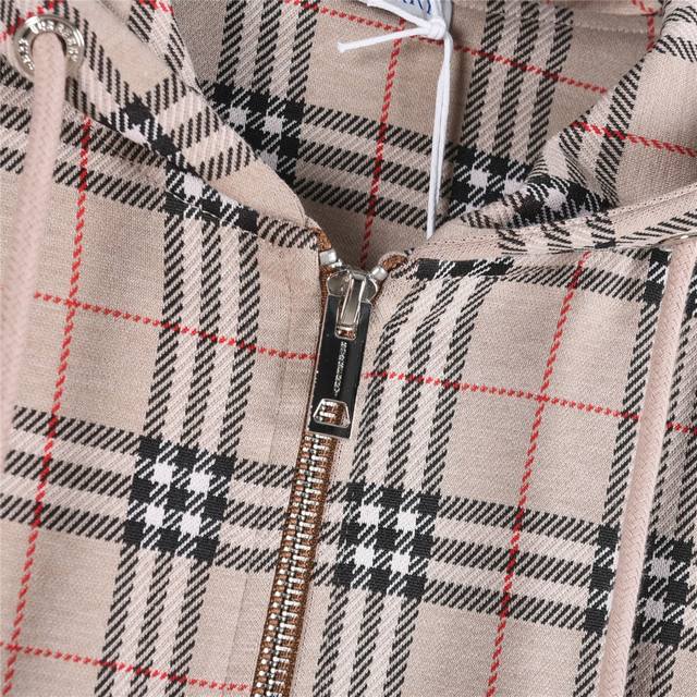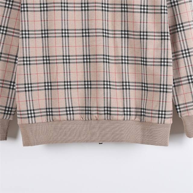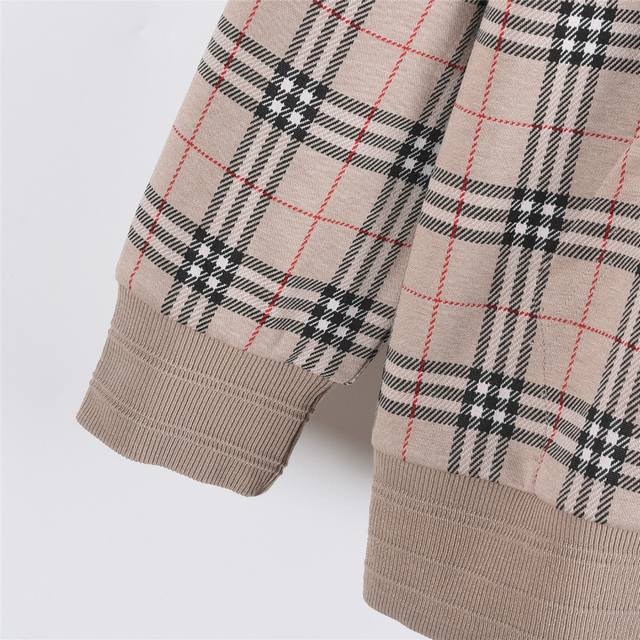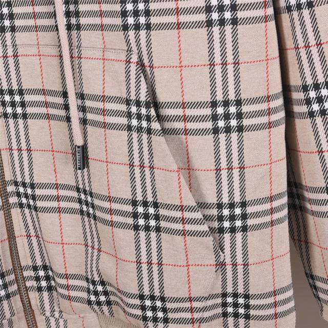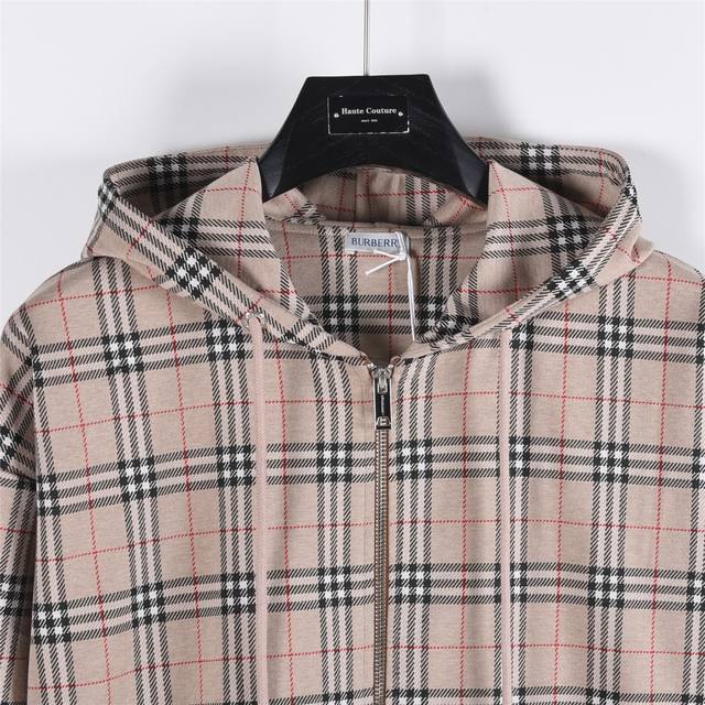 Burberry 25Fw Check Zipper Drawstring Hooded Jacket. Made from a cotton blend fabric, this jacket boasts natural skin-friendly, soft, and highly absorbent properties, maintaining its shape even after multiple wears and washes. The intricate jacquard weave creates a visually rich and smooth pattern, ensuring its durability and resistance to fading and wear even after repeated washing. Precisely cut using a positioning cutting machine, the check pattern is continuous and symmetrical, showcasing a refined visual effect. The hood seamlessly integrates with the body, and the zipper is precisely installed for smooth operation. Every detail has been carefully considered and processed. Colors: Khaki, Black. Size: S-XL.