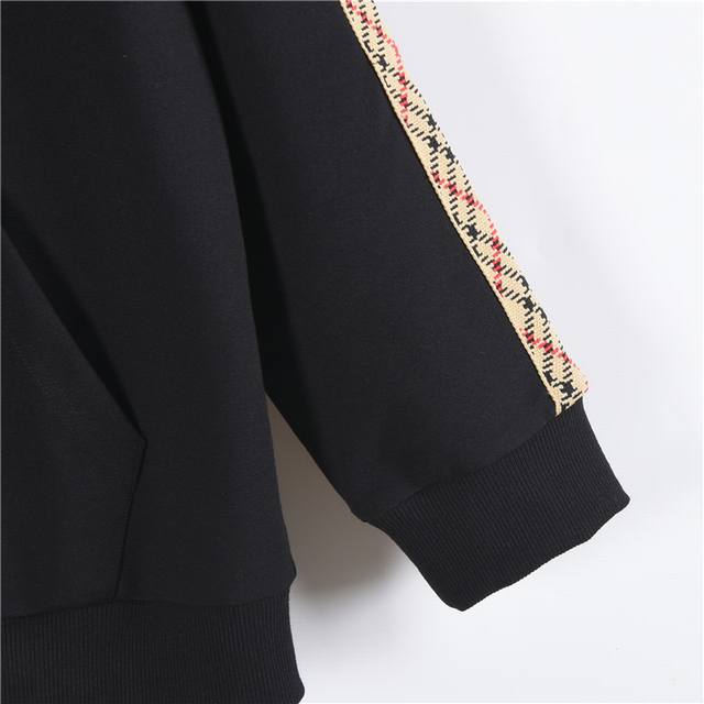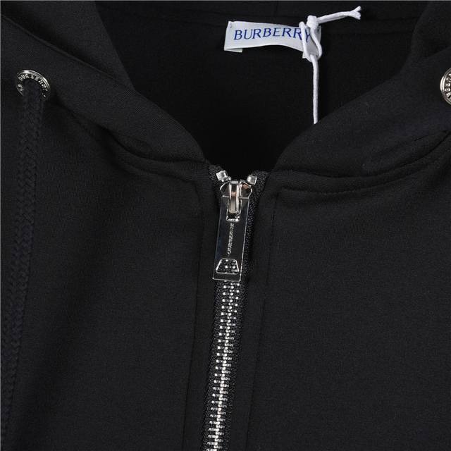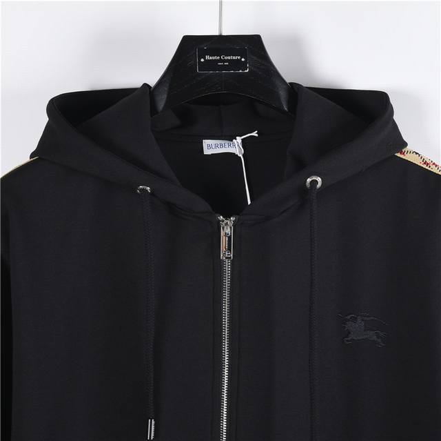 Burberry 25Fw Side-Quarter Ribbon Equestrian Embroidery Double Zip-Up Jacket. This zip-up hoodie is made from lightweight fleece cotton and features the iconic beige Burberry quilted trim. It has a slim fit and is adorned with a tonal equestrian logo embroidery. Features include a two-way zip closure, drawstring hood, storage pockets, ribbed knit trim, and an embroidered equestrian logo on the chest. Best paired with matching trousers! Color: Black. Size: S-XL.
