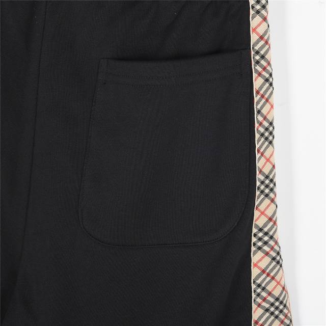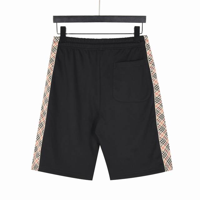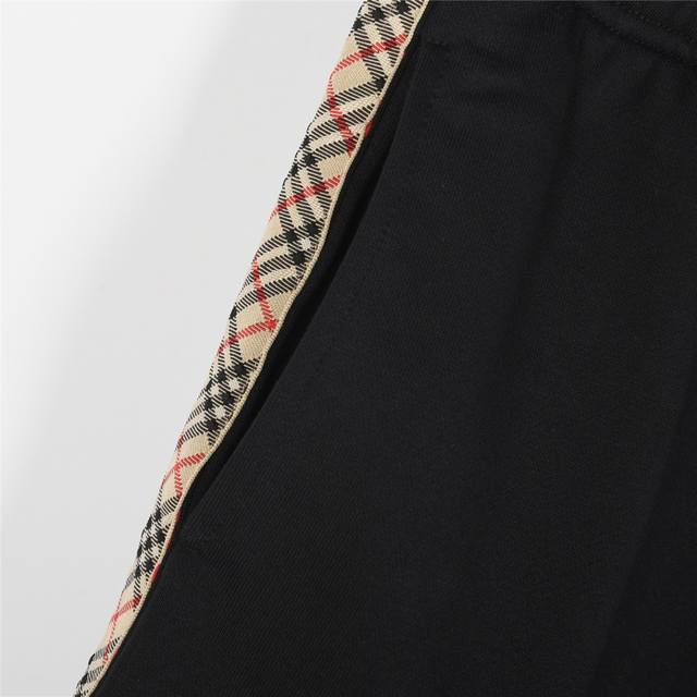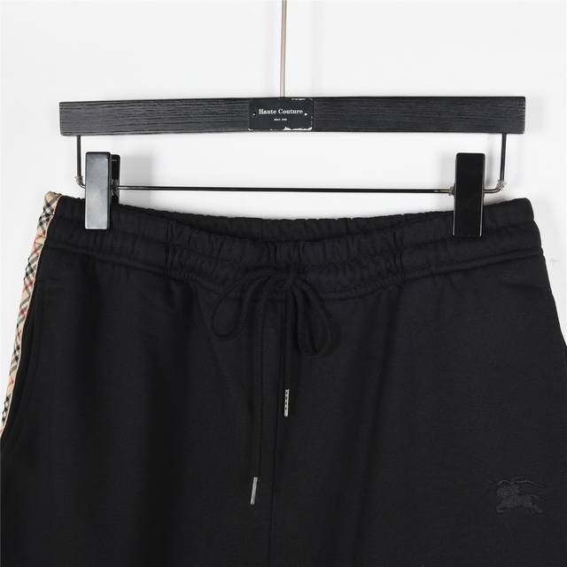 Burberry 25Ss Equestrian Logo Embroidered Check Webbing Patchwork Shorts. Crafted from select 400g pure cotton terry fabric, these shorts boast exceptional texture and a substantial weight, exuding high quality. The classic five-quarter length cut offers a casual yet sophisticated style. The equestrian embroidery is exquisite and lifelike, showcasing the brand's craftsmanship in every stitch and revealing its unique brand essence. The webbing patchwork design adds a distinctive touch, enhancing the overall fashion and trendy feel. The subtly integrated brand logo not only serves as a finishing touch but also signifies exceptional quality and a unique identity, contributing to the shorts' distinctive charm and superior quality. Color: Black. Size: S-XL.
