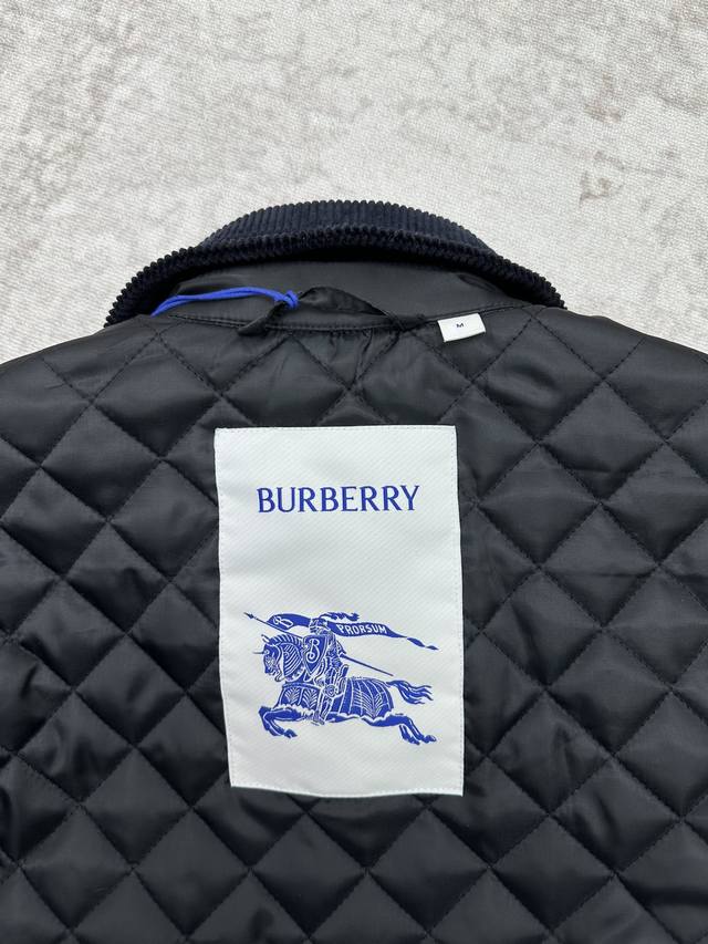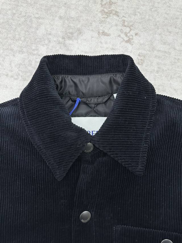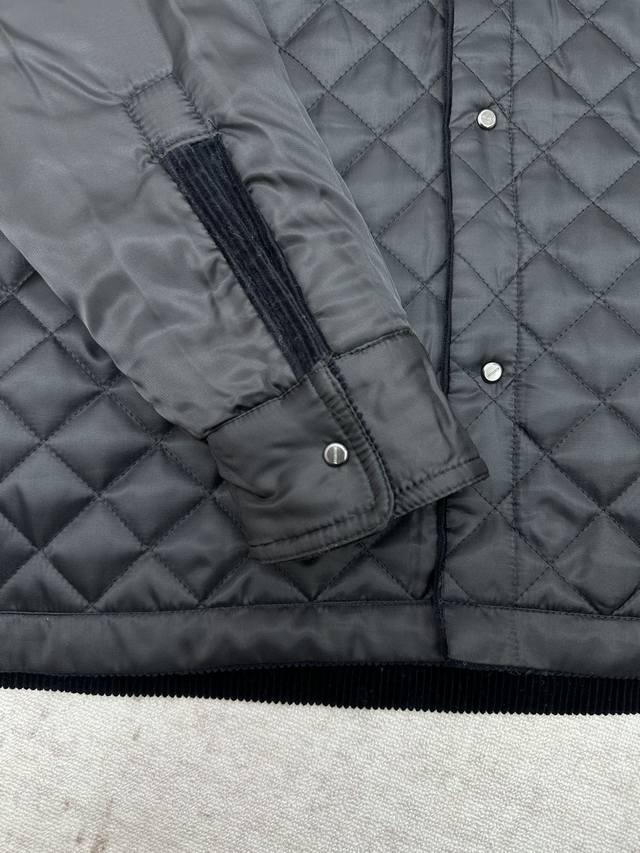 Burberry 25Ss New Corduroy Snowdon Down Jacket is crafted from cotton corduroy and filled with goose down and feathers. It features a graphite grey Burberry check cotton lining adorned with a leather equestrian stamp appliqu