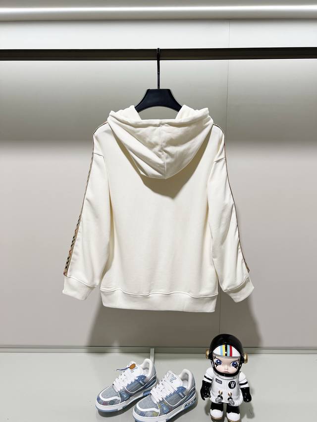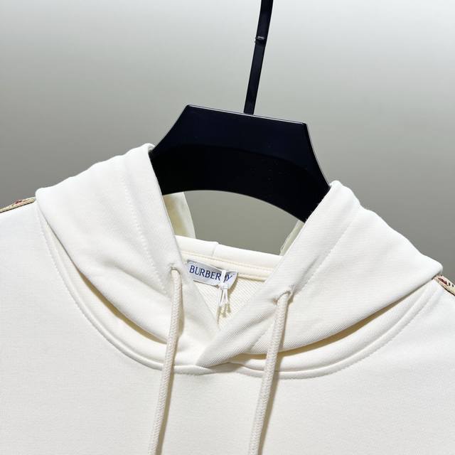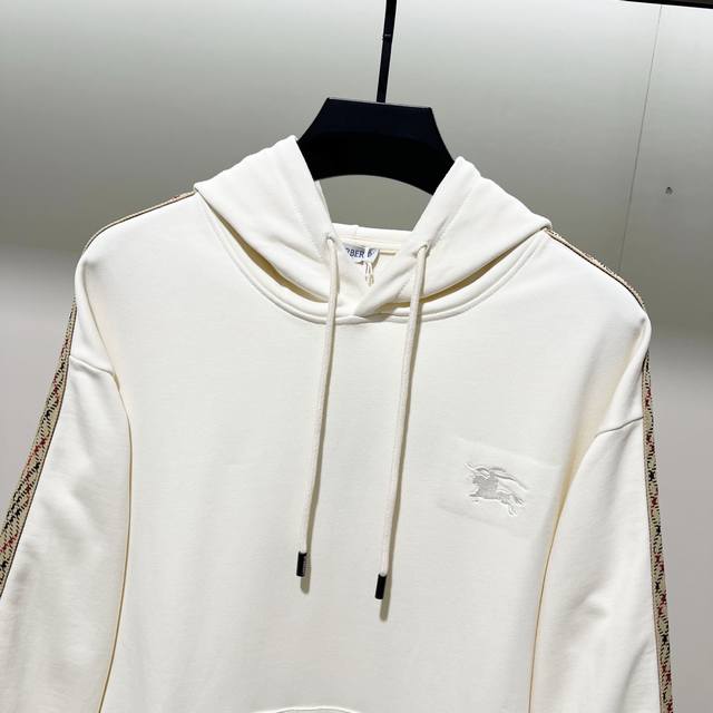 Burberry 420g Custom Fabric Hooded Sweatshirt. Features include a miniature equestrian logo embroidery, plaid patchwork sleeves, and high-quality craftsmanship. Officially synchronized high-quality version. Stylish, versatile, and trendy. Made with original fabric and tags. Colors: Black, Apricot, Khaki. Sizes: XS-L.