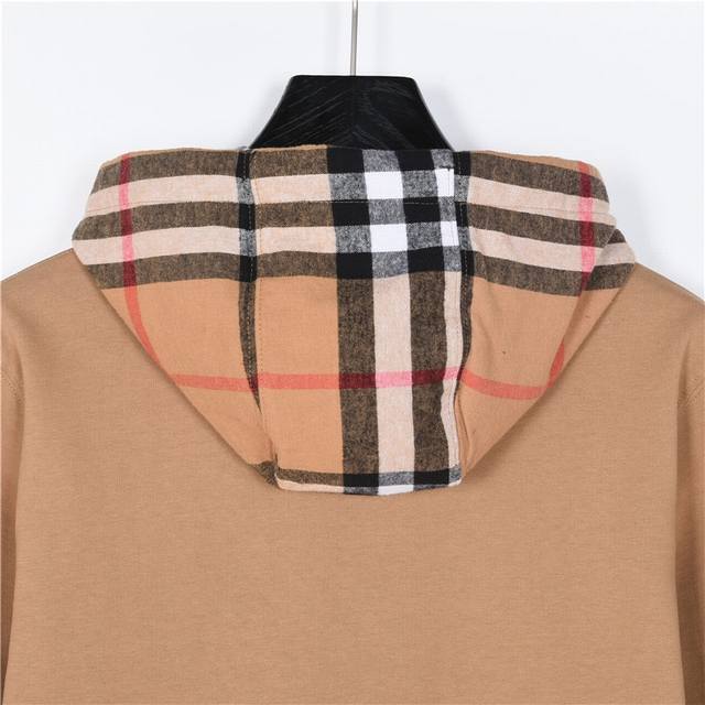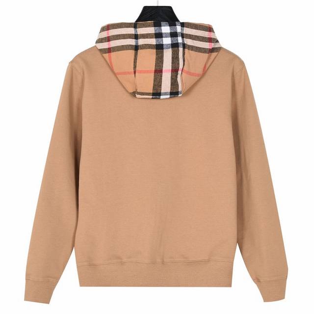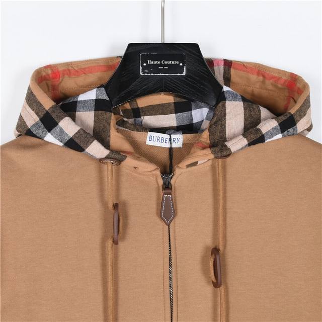 Burberry Check Hooded Jacket with Double Zipper. Developed from the original design by Ddd, using 450g Bbr's custom sweatshirt fabric. Features a contrasting flannel check hood with leather accents at the drawstring. The surface has been treated for a smooth feel. The check fabric is 100% coarse cotton with a high yarn count and a thick feel. It features 1x1 pure cotton ribbed fabric. The ribbed fabric is dyed to match the body color. The check fabric lining of the hood is quilted, not a single layer! The check spacing and color are customized 1:1 to the original. Each hood is identical, with symmetrical stripes on all sides and top and bottom. This requires exceptional tailoring skills and is time-consuming, labor-intensive, and uses high-quality materials. The flannel material is a special material for this year. The drawstring area includes a five-piece set on one side, leather ring, brass eyelet tag, bell, and zipper, replicating the original design. It is also embellished with leather trim. Ddd Colors: Black, Khaki Ddd Sizes: S-XL Ddd