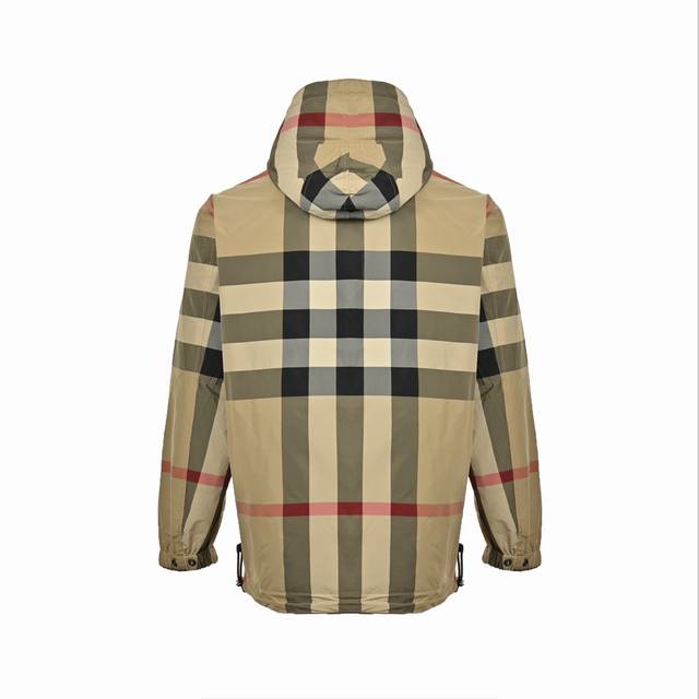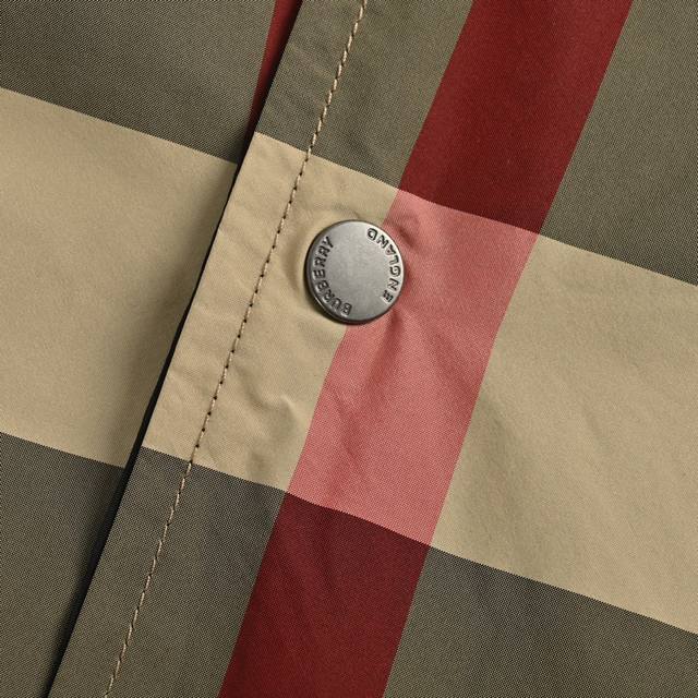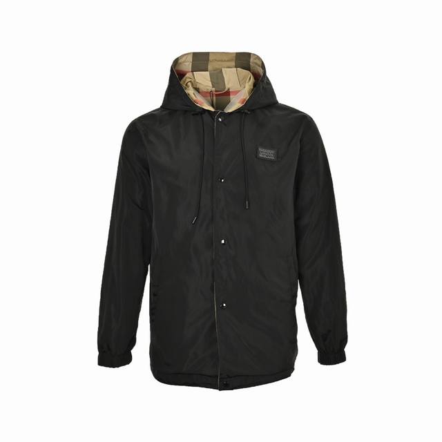 Bur reversible taffeta hooded coat with silicone logo plaque, produced by OEM P. Unisex early fall collection. Side A features a solid color design with a Bur 3D silicone logo plaque on the chest, snap-stud placket, drawstring hood and hem, and snap-stud welt side pockets. Side B features Bur check, snap-stud placket, drawstring hood and hem, elastic snap-stud cuffs, and a regular fit with zippered pockets. Custom-woven and custom-dyed