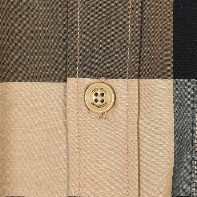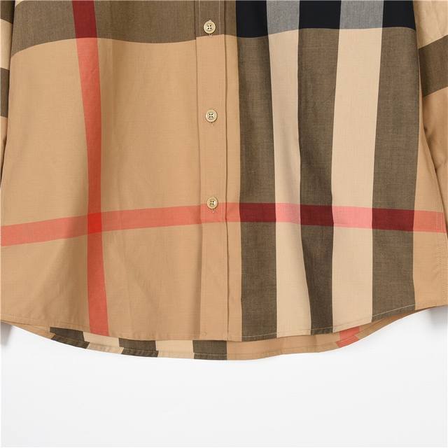 Burberry Classic Large Check Shirt (Ddd). Custom-made to match the original, using 20-count combed cotton single-thread yarn. All yarns are custom-dyed, and the final weave method is determined. The check pattern, size, and line thickness all meet the Y-version standard, and the fabric has no tail slant. Infrared cutting ensures accurate stripe and check alignment for each piece, guaranteeing the quality of the bulk order. Custom-made Tarobe oil-sealed spray-painted buttons have a natural shine, unlike market versions which use resin buttons. Thinning is applied to the cut pieces, collar, collar stand, and cuffs. All pieces are precisely aligned using infrared laser positioning. Each size is a pre-cut piece, with the front panel, pockets, and sleeves all aligned. This process is time-consuming and resource-intensive, resulting in a classic, simple, and high-end look. The fabric is comfortable and soft yet structured. Top-tier imported version, sold freely without fear of quality pressure! Colors: Khaki, Blue, Gray. Sizes: S-XL.