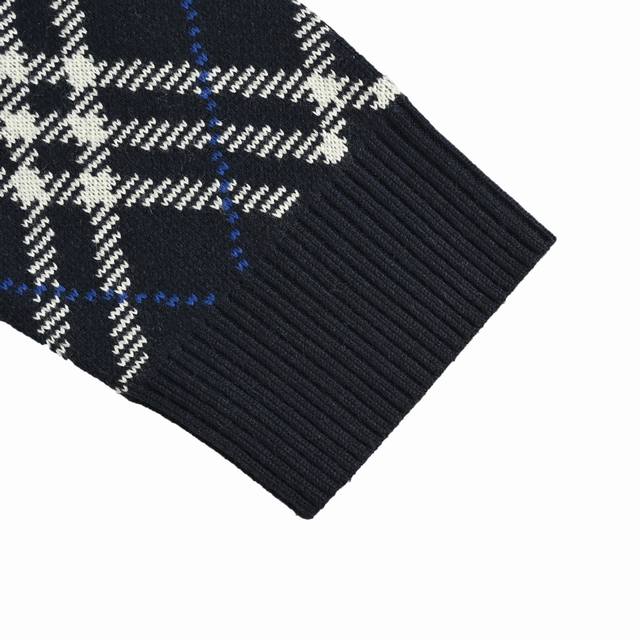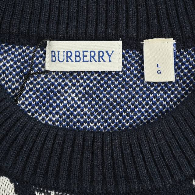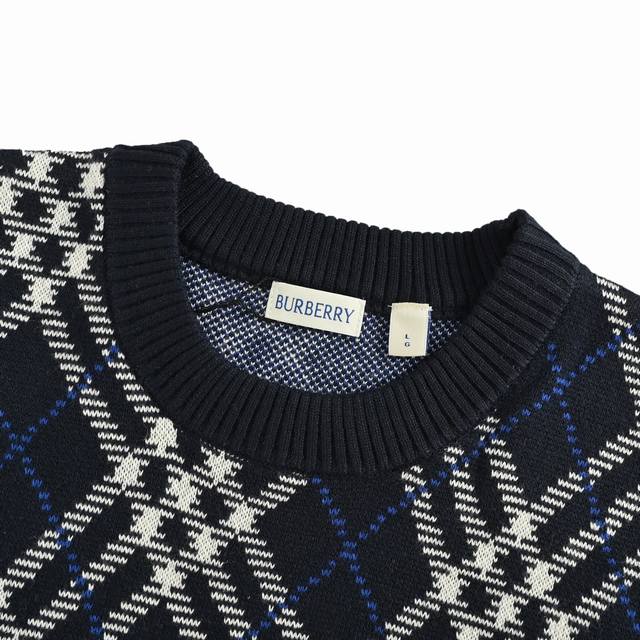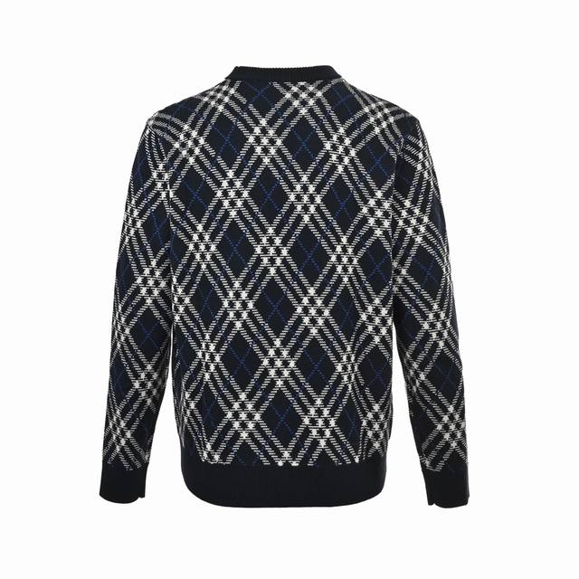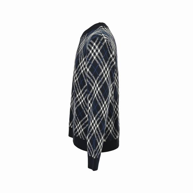 Burberry Diamond Check Crew Neck Sweater. Developed from a high-quality wool and polyester blend, this sweater combines the softness and comfort of wool with the durability of polyester. The classic Burberry check is presented through a fine jacquard knit, creating a clear and three-dimensional pattern that showcases the brand's iconic design. The sweater features a regular cut, a slim and clean fit, and is comfortable and stylish. Ribbed knit trim at the neckline, cuffs, and hem enhances the garment's elasticity while maintaining its shape. The exquisite knitting ensures a tight, even fabric with a smooth and delicate feel. The fabric offers good warmth and breathability, making it suitable for spring and autumn. The overall workmanship is meticulous, with even and fine stitches, reflecting the brand's exquisite craftsmanship in every detail. The check pattern is precisely aligned, and the color transitions are natural, showcasing a perfect fusion of British tradition and modern fashion. Size: SL.