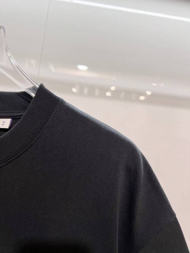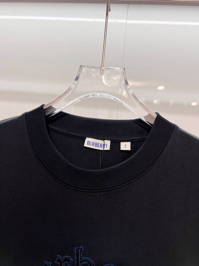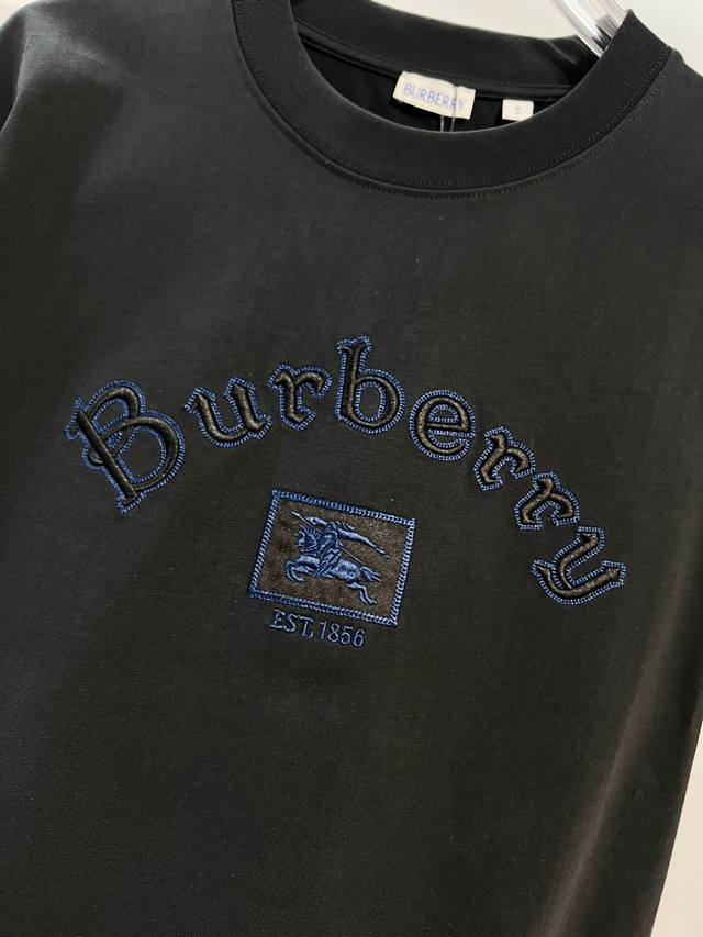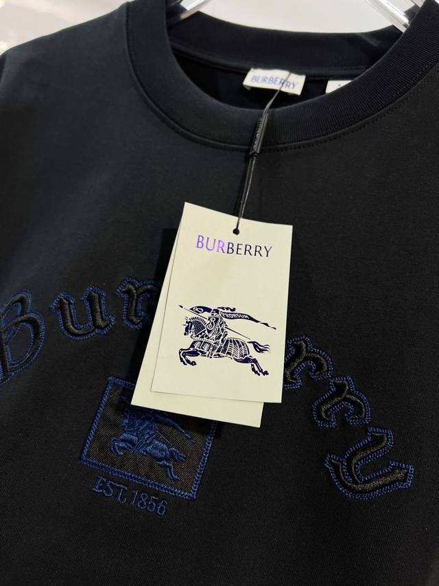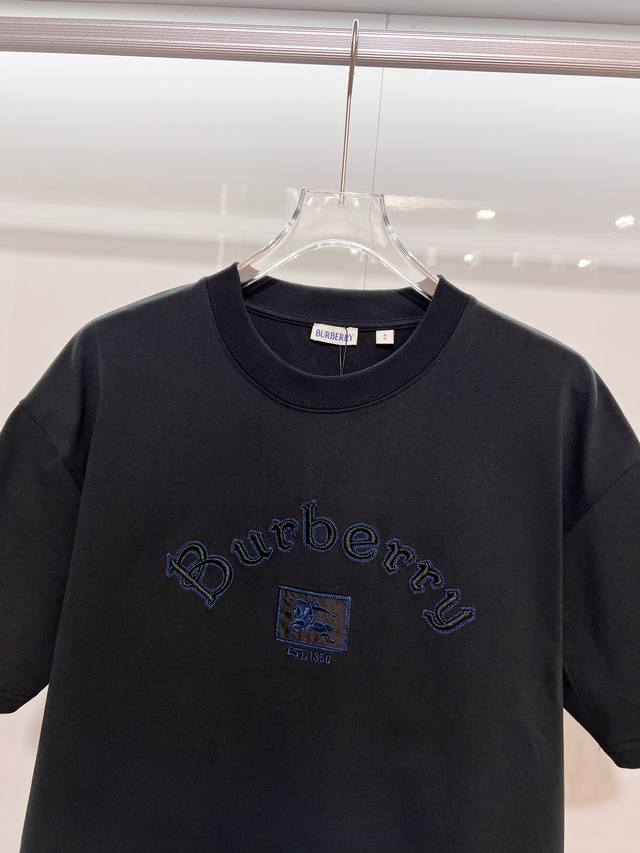Burberry High-Quality 320g Crew Neck Short Sleeve T-Shirt. Features the brand's classic embroidered 1856 horse logo. Officially synchronized with the 2025 SS collection. High-quality, fashionable, versatile, and trendy. Made with original fabric and tags. Includes hangtags, neck labels, and washing instructions. Colors: Black, White. Sizes: Xs, S, M, L.